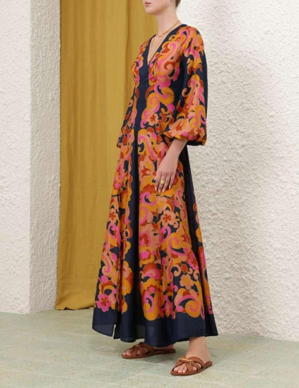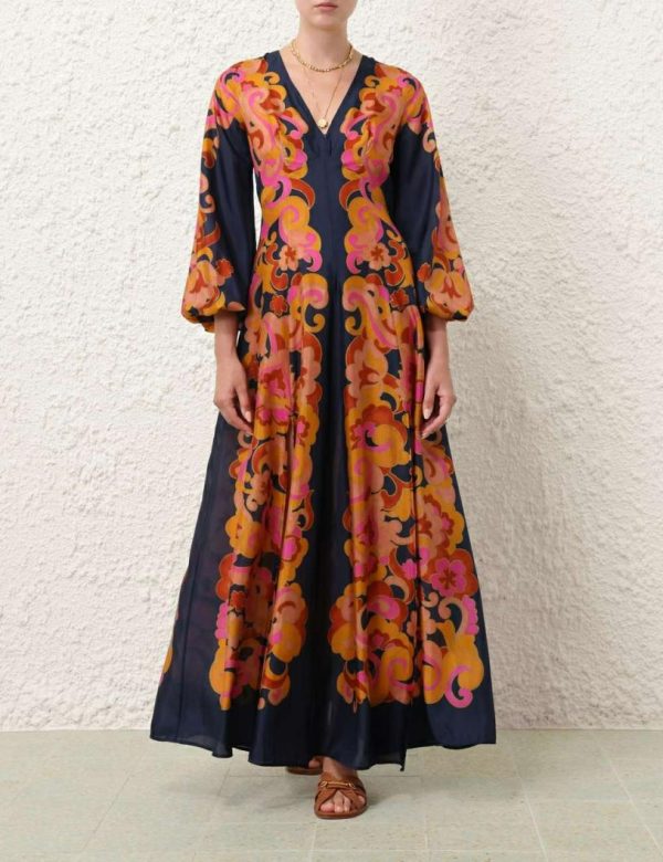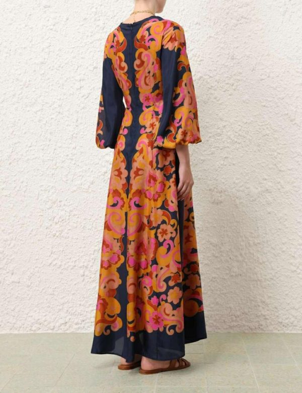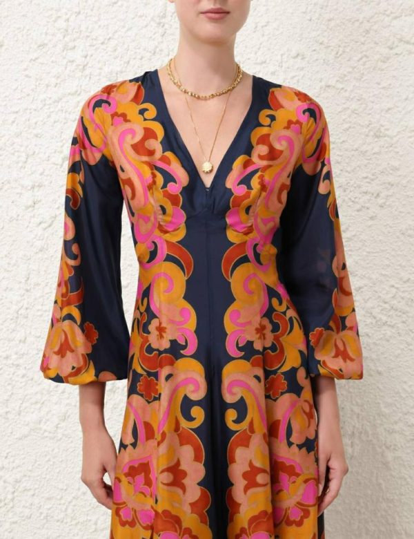 The Acadian Long Sleeve Maxi Dress in Navy Paisley from our Resort Swim 2024 Collection. A silk long sleeve dress featuring a plunging neckline and blouson sleeves.
