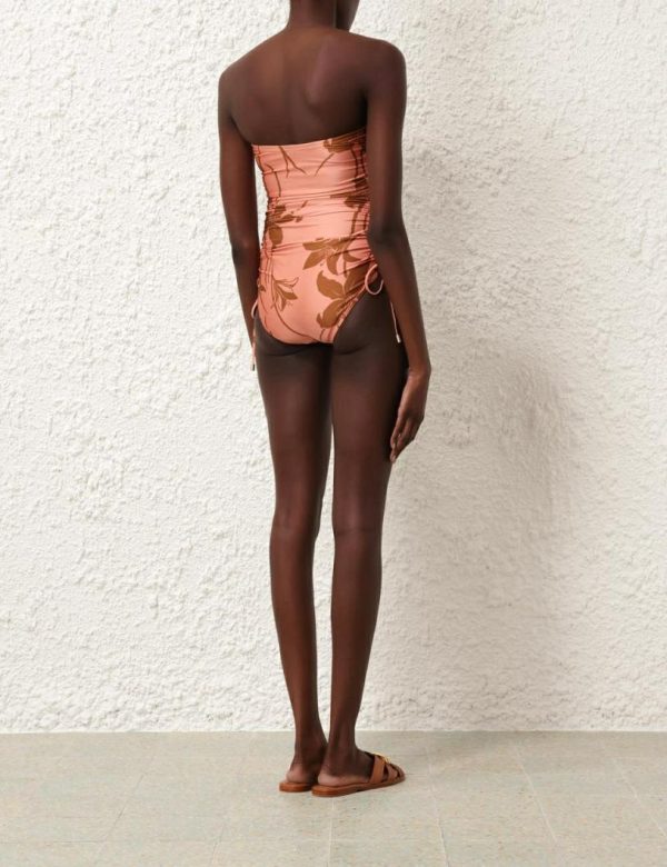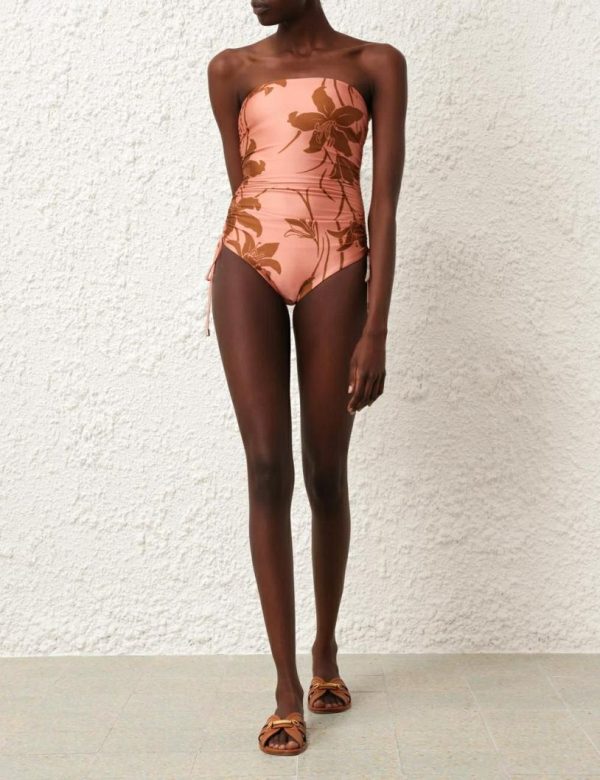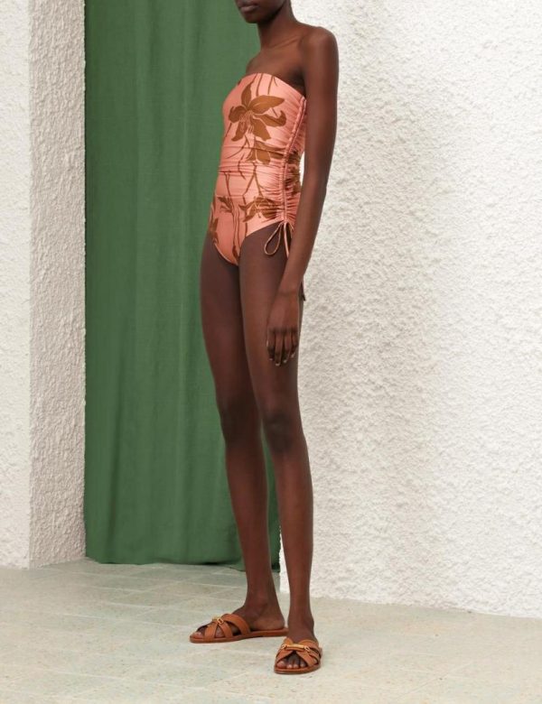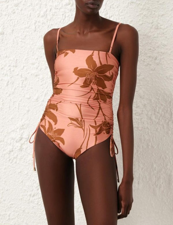 The Acadian Ruched Side 1PC in Coral/Tan Floral from our Resort Swim 2024 Collection. A lycra one piece featuring ruched sides, a shelf bra, gripper elastic along the chest and detachable straps.