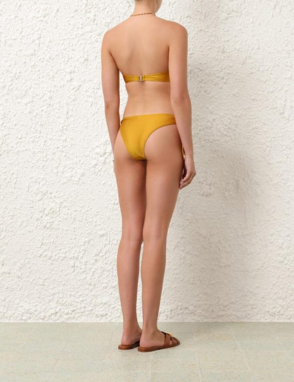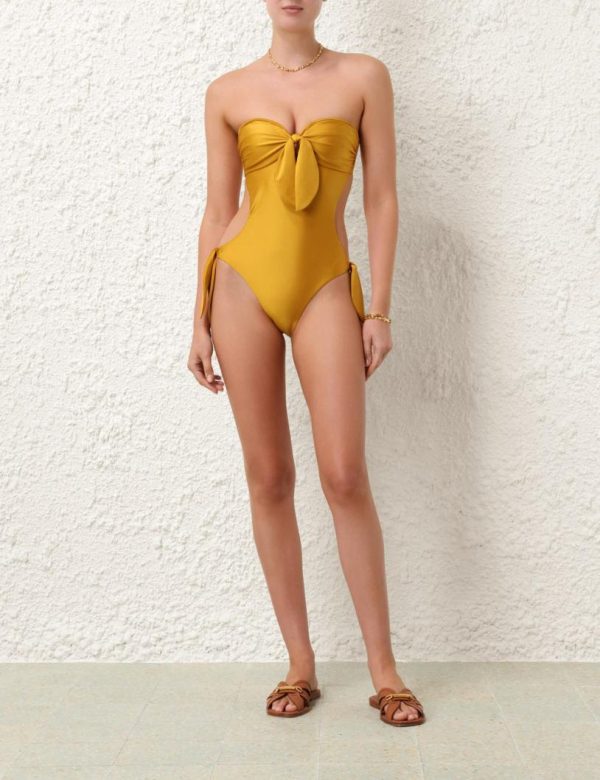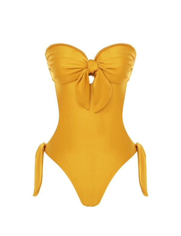 The Acadian Scarf Tie 1PC in Honey from our Resort Swim 2024 Collection. A shiny lycra one piece featuring front and side tie details and boning along the side seams.