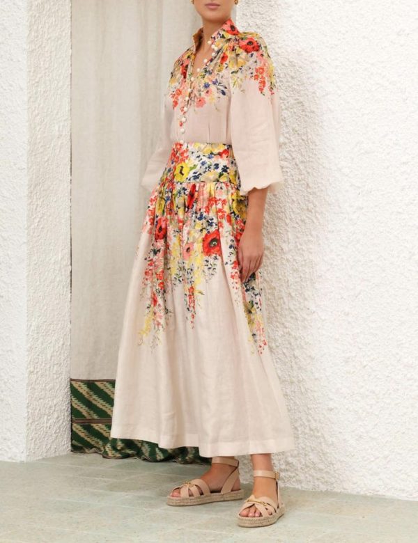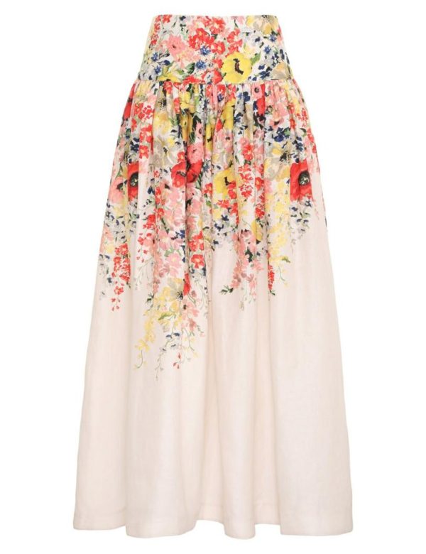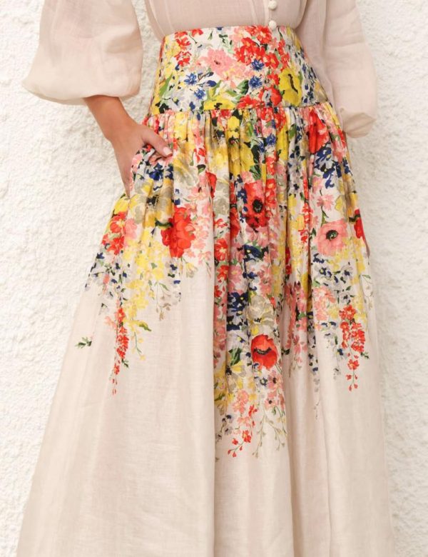 The Alight Midi Skirt in Ivory Floral from our Resort Swim 2024 Collection. A linen midi skirt featuring a wide waistband and side seam pockets.