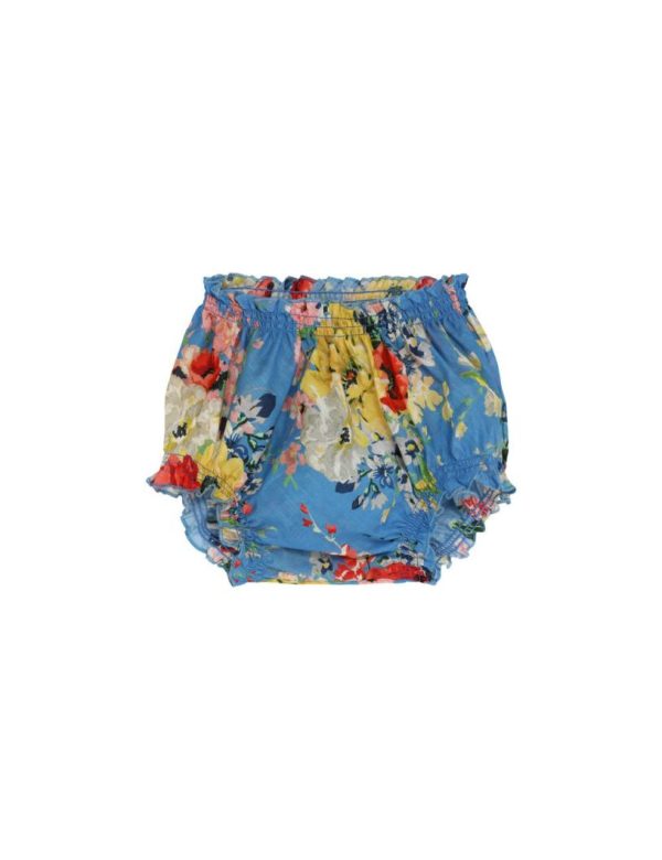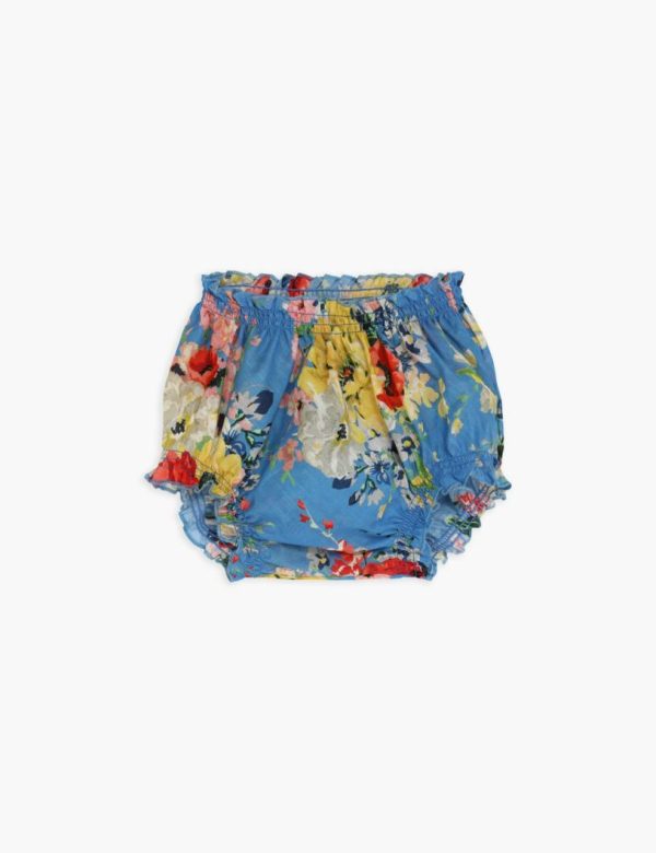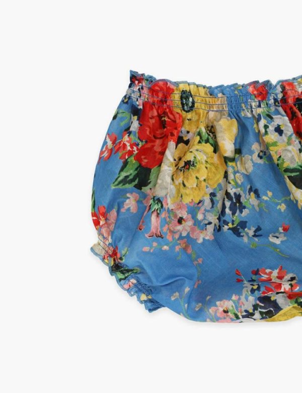 The Alight Bloomer in Blue Floral from our Resort Swim 2024 Collection. A cotton bloomer with elastic trims and frilled edges.
