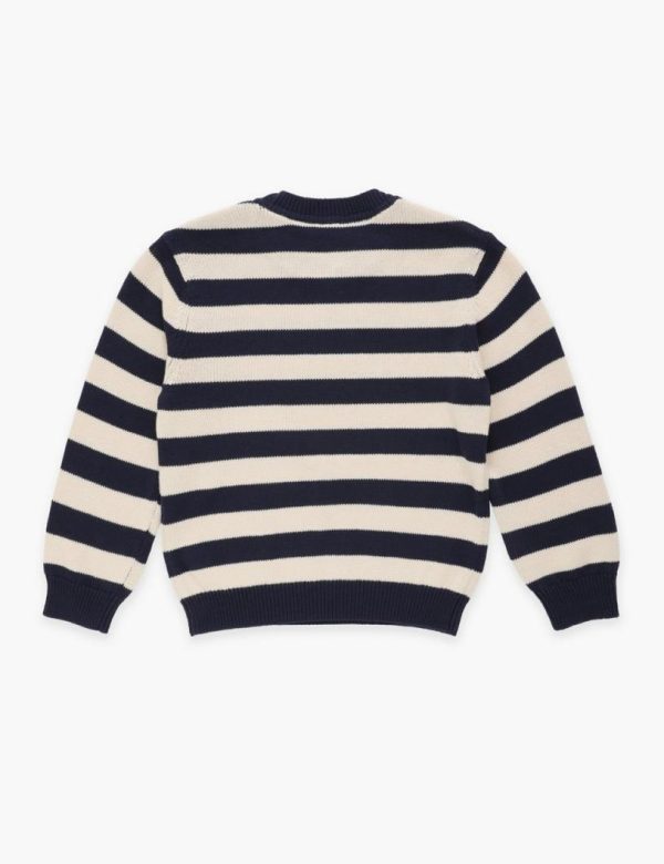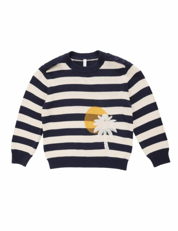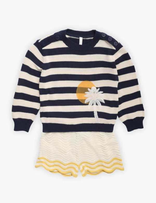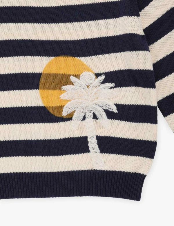 The Alight Embroidered Sweater in Multi from our Resort Swim 2024 Collection. A knitted long sleeve sweater featuring a sun motif and an embroidered palm tree.