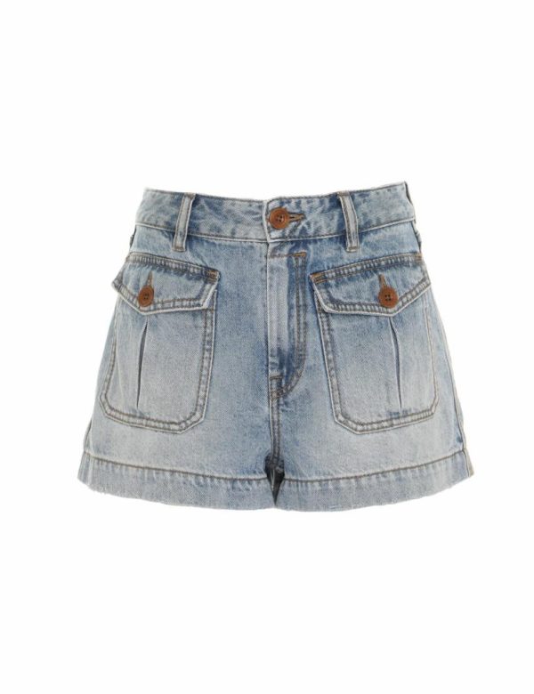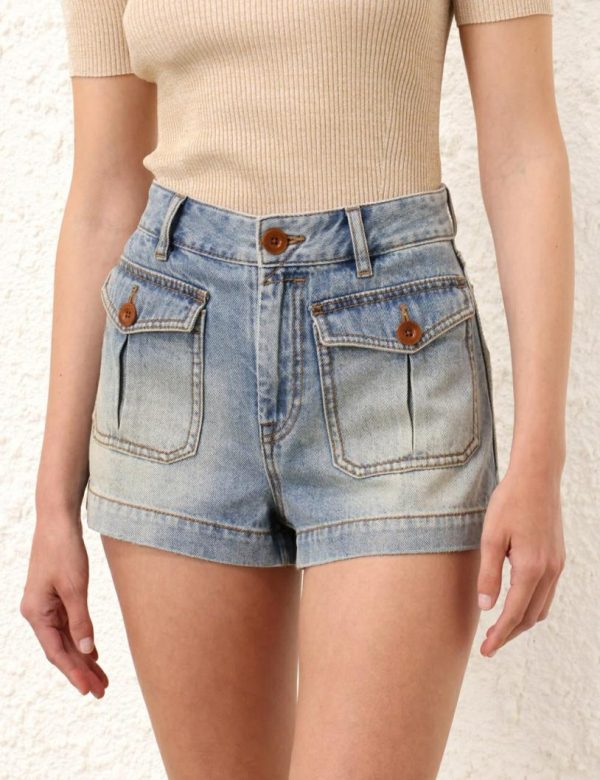 The Raie Mini Short in Faded Blue from our Summer Swim 2023 Collection. High rise denim shorts featuring front patch pockets with flaps.