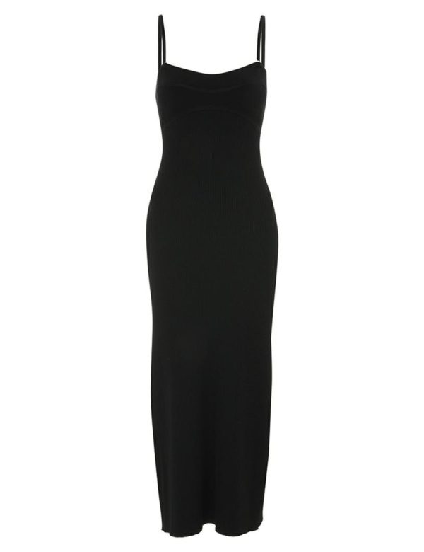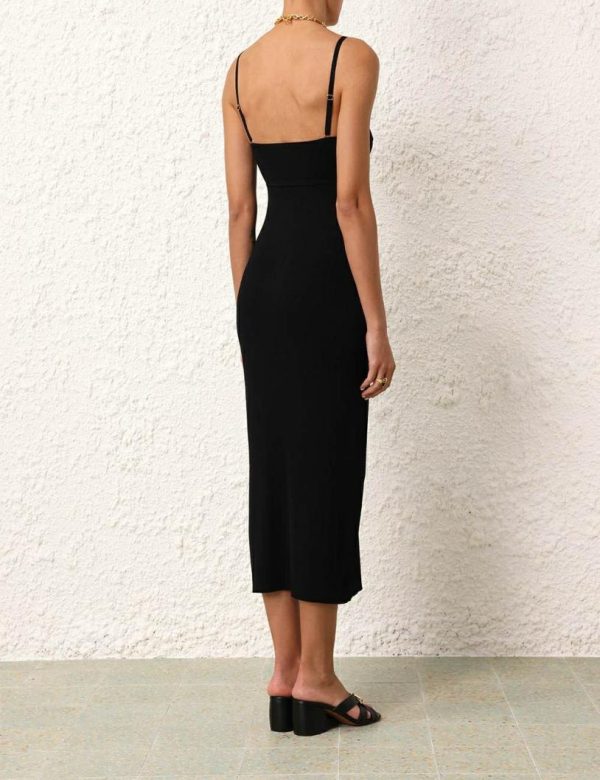 The Alight Panelled Column Dress in Black from our Resort Swim 2024 Collection. A knitted midi dress featuring adjustable straps.