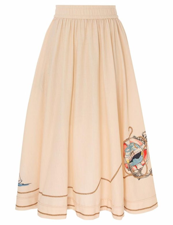 The Alight Swing Skirt in Beige from our Resort Swim 2024 Collection. A cotton swing midi skirt featuring an elasticated waistband and side seam pockets.
