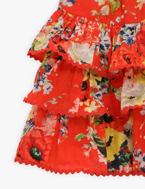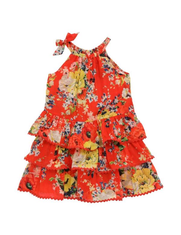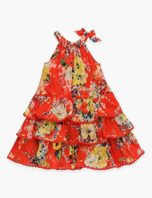 The Alight Tiered Halter Dress in Red Floral from our Resort Swim 2024 Collection. A cotton floral dress featuring an elasticated neckline and ric rac trim details.