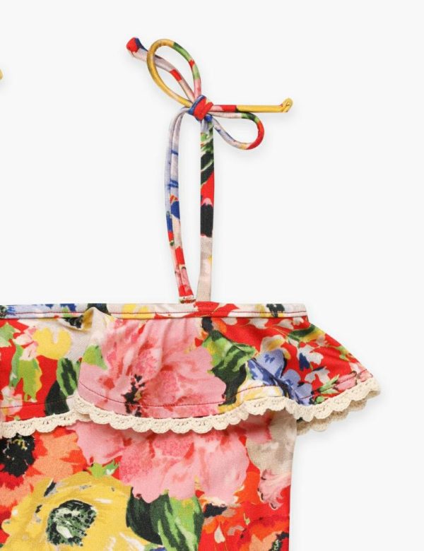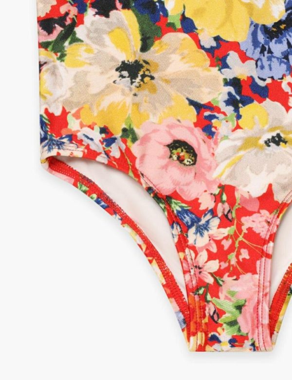 The Alight Trim Frill 1PC in Red Floral from our Resort Swim 2024 Collection. An Italian lycra one piece featuring a frilled neckline with crochet edging.