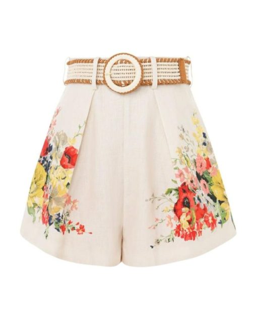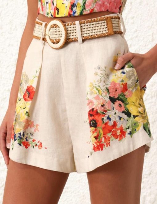 The Alight Tuck Short in Ivory Floral from our Resort Swim 2024 Collection. A high waisted linen short featuring placement artwork and a removable wide fabric belt.