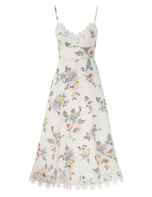 The Applique Picnic Dress in Blue Floral from our Resort 2024 Collection, Matchmaker. A linen midi dress featuring trims of lace applique throughout.