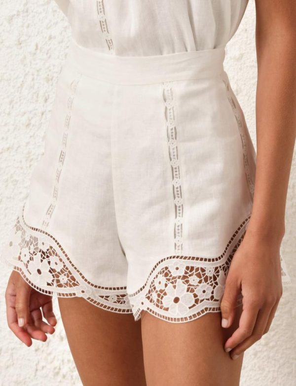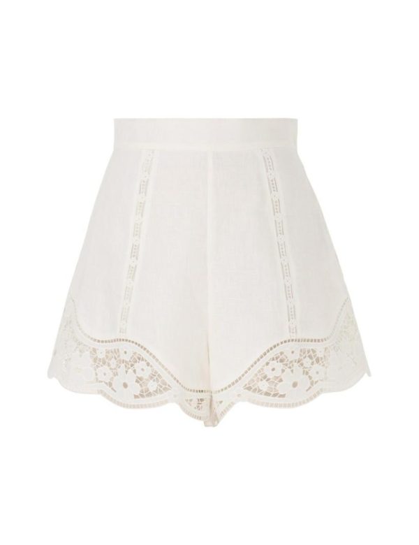 The August Broderie Shorts in Ivory from our Resort Swim 2024 Collection. A high waisted short featuring panels of broderie lace throughout.