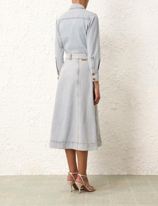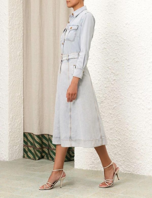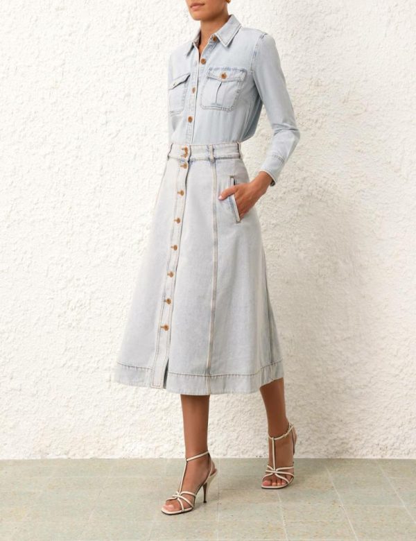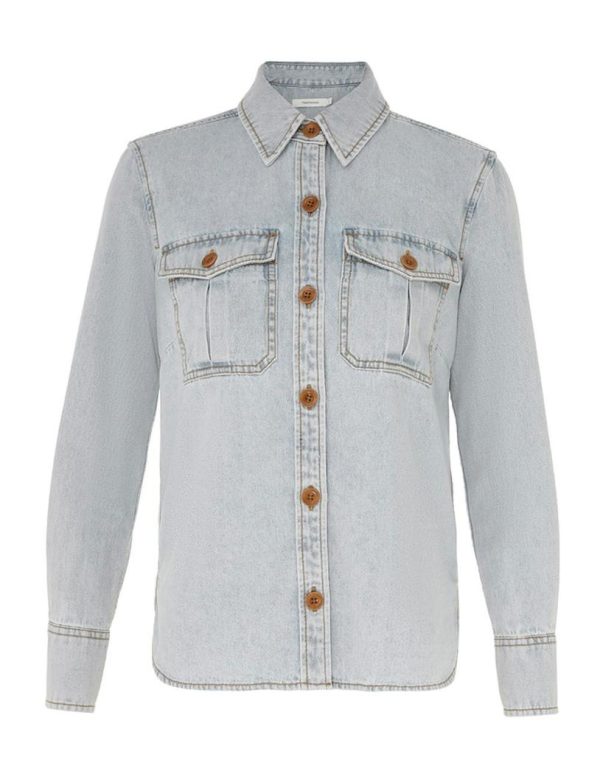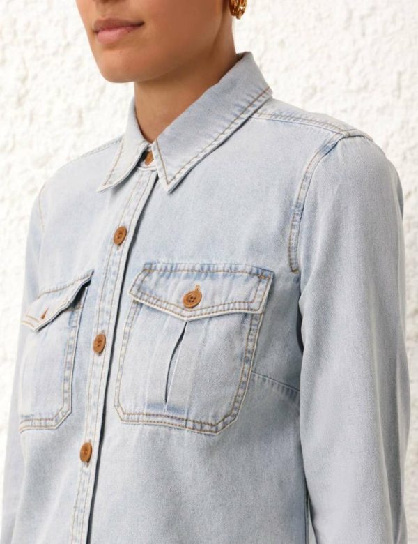 The August Denim Body Shirt in Storm Blue from our Resort Swim 2024 Collection. A denim long sleeve shirt with front pockets.