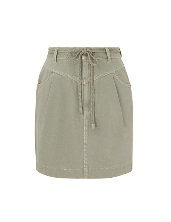 The August Denim Utility Skirt in Khaki from our Resort Swim 2024 Collection. A denim mini skirt featuring belt loops and pockets.