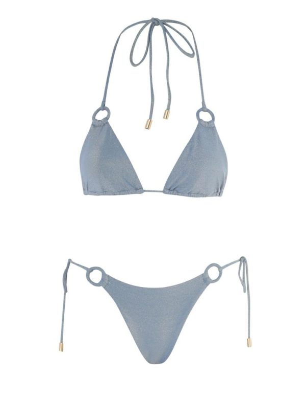 The August Lurex Ring Tie Bikini in Dusty Blue from our Resort Swim 2024 Collection. An Italian lycra triangle bikini top and low rise, skinny pants featuring rings throughout and self tie straps with toggle ends.