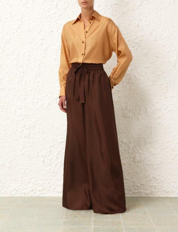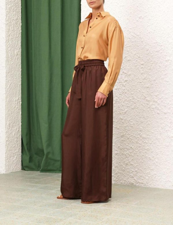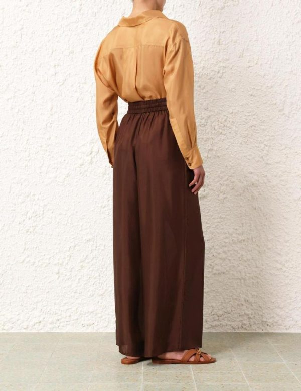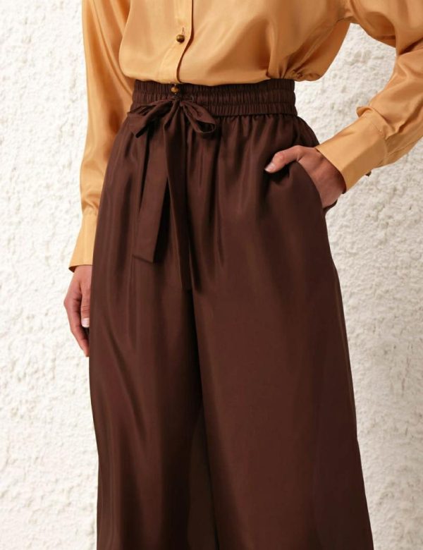 The August Relaxed Pant in Chocolate from our Resort Swim 2024 Collection. A silk wide leg relaxed pant featuring an elasticated waistband.