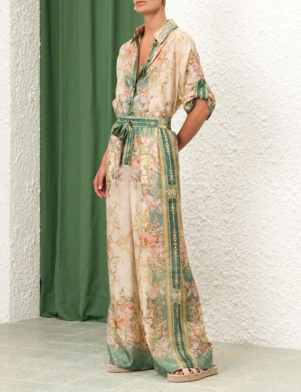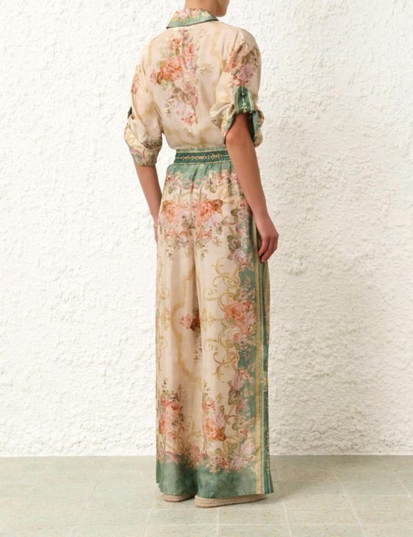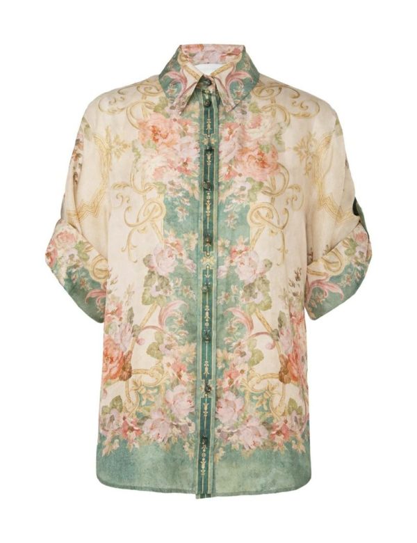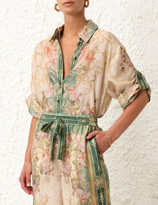 The August Short Sleeve Shirt in Khaki Floral from our Resort Swim 2024 Collection. A silk shirt featuring rolled sleeves held by a sleeve tab.