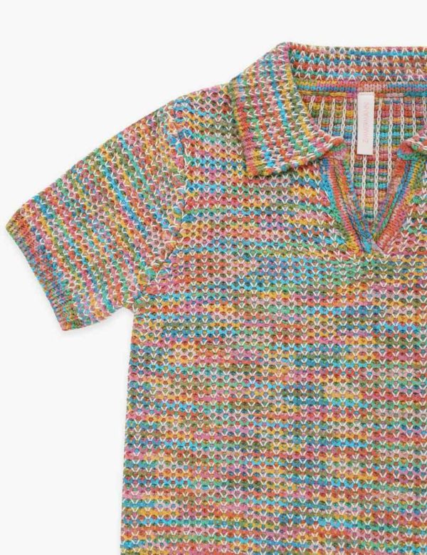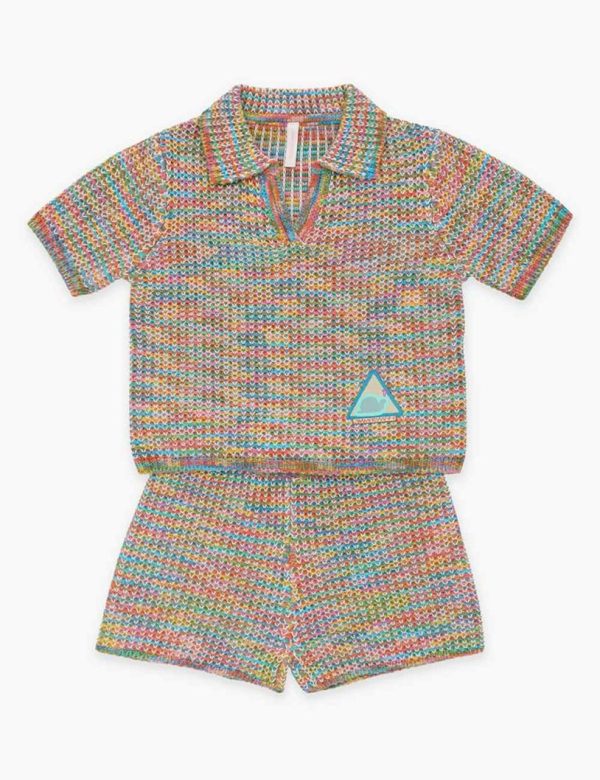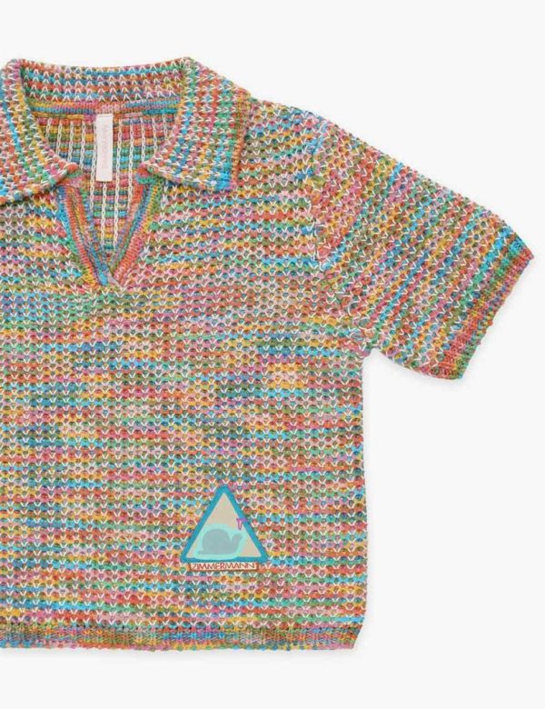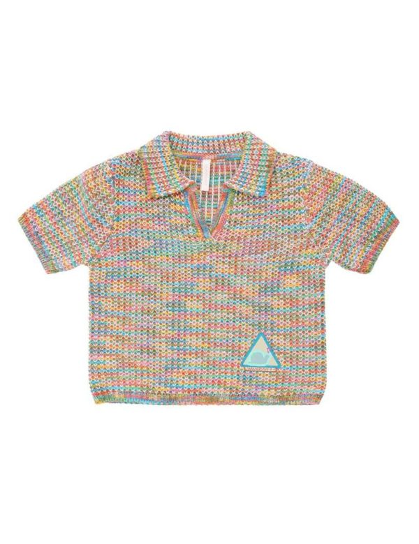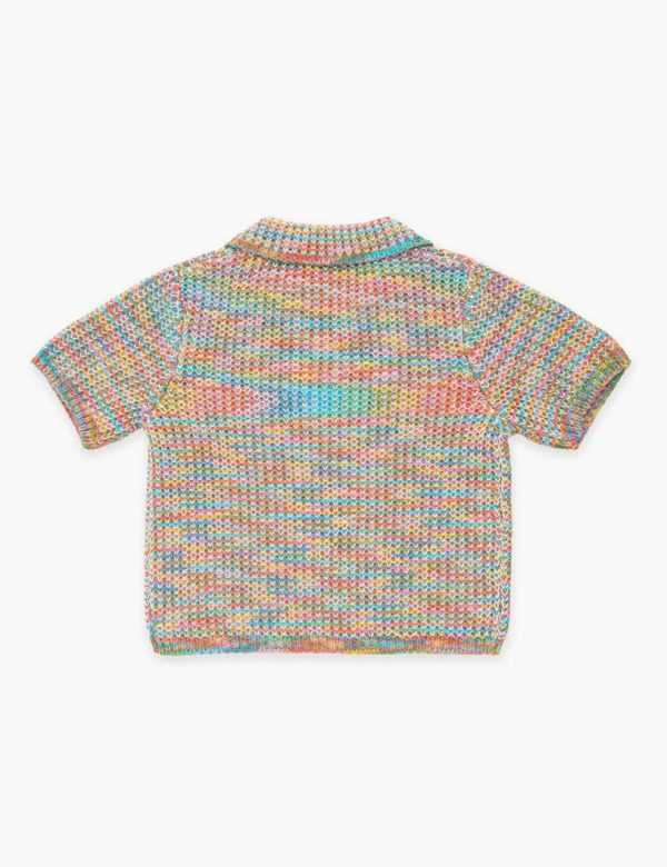 The August Textured Knit Polo in Multi from our Resort Swim 2024 Collection. A knit polo top featuring an Embroidered snail patch.