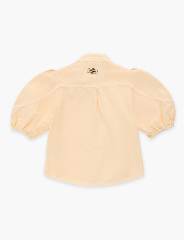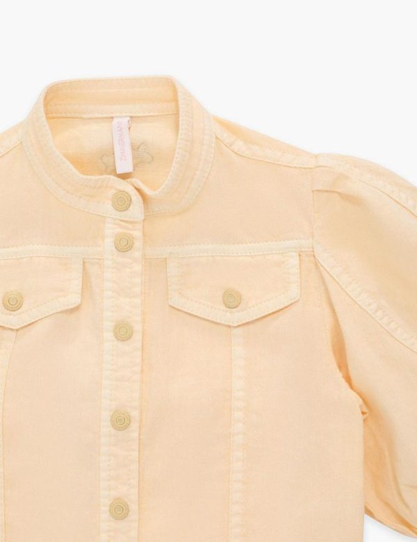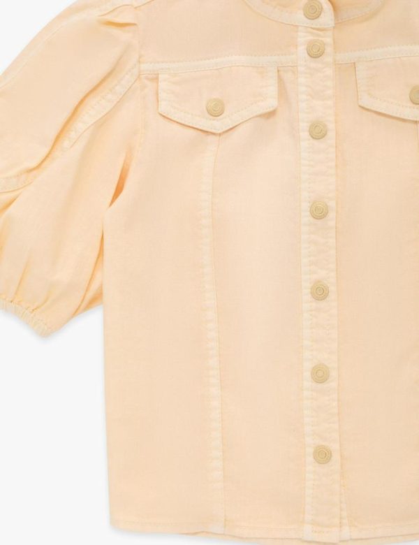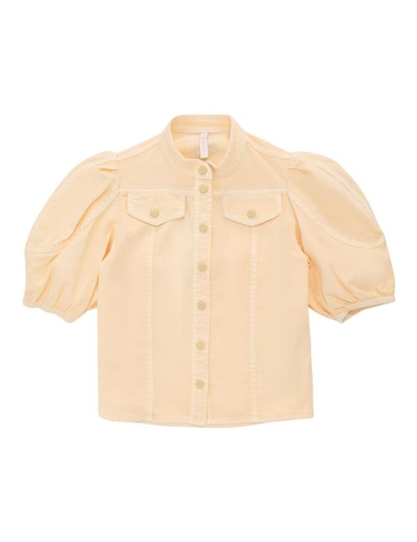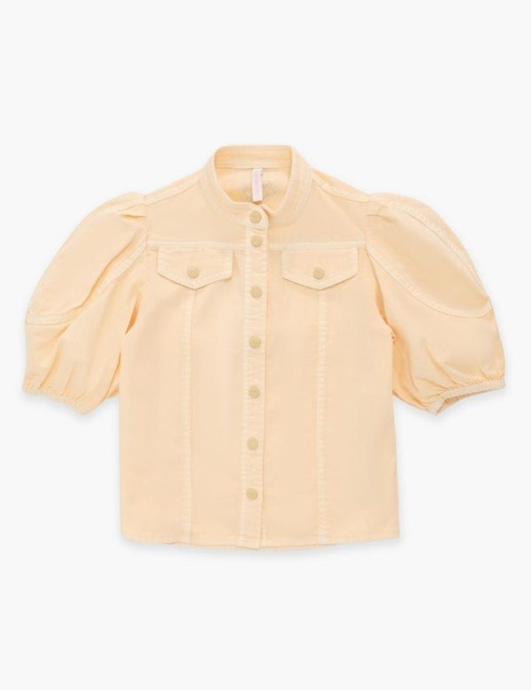 The August Utility Denim Top in Macaroon from our Resort Swim 2024 Collection. A denim button up top featuring panelling and an elasticated sleeve hem.