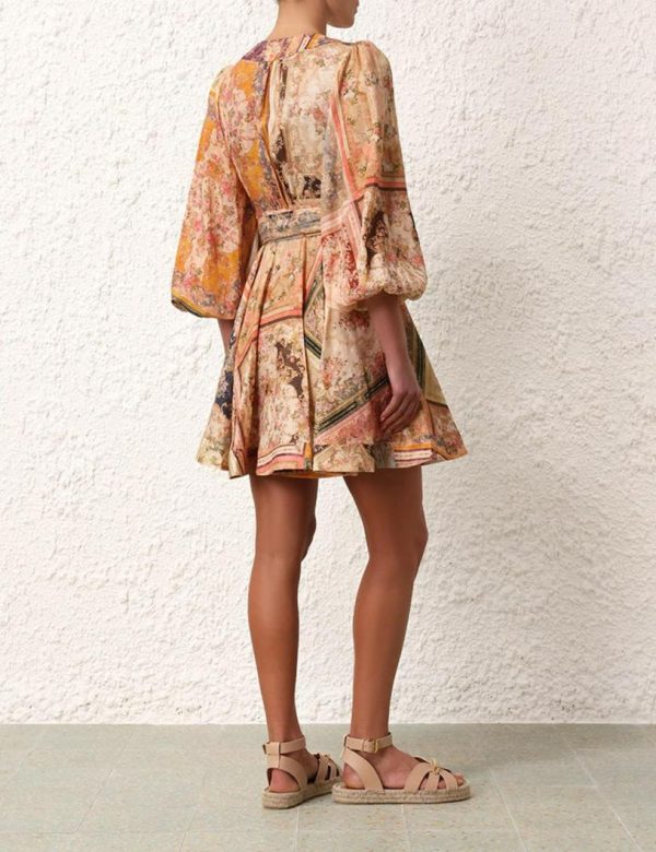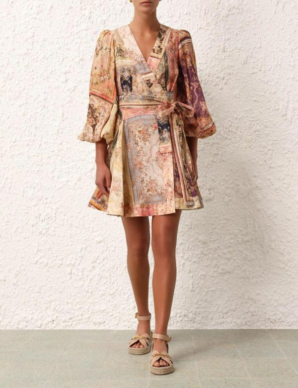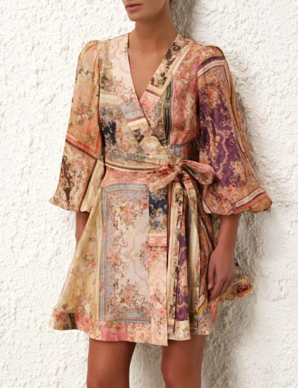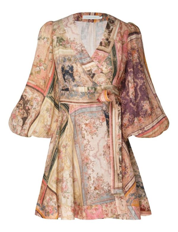 The August Wrap Mini Dress in Patch Floral from our Resort Swim 2024 Collection. A linen wrap mini dress featuring elasticated sleeve hems and french seams throughout.