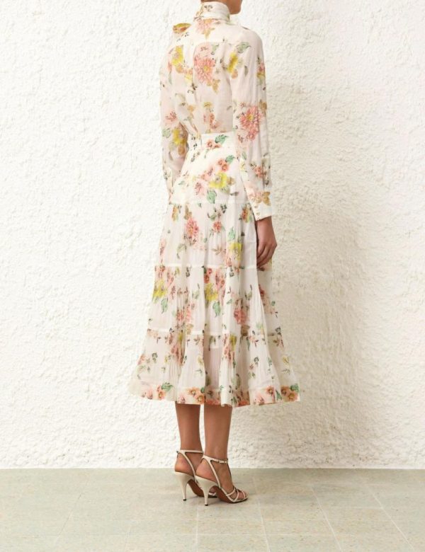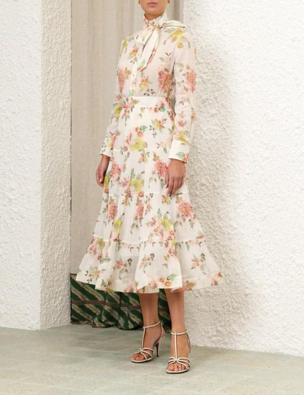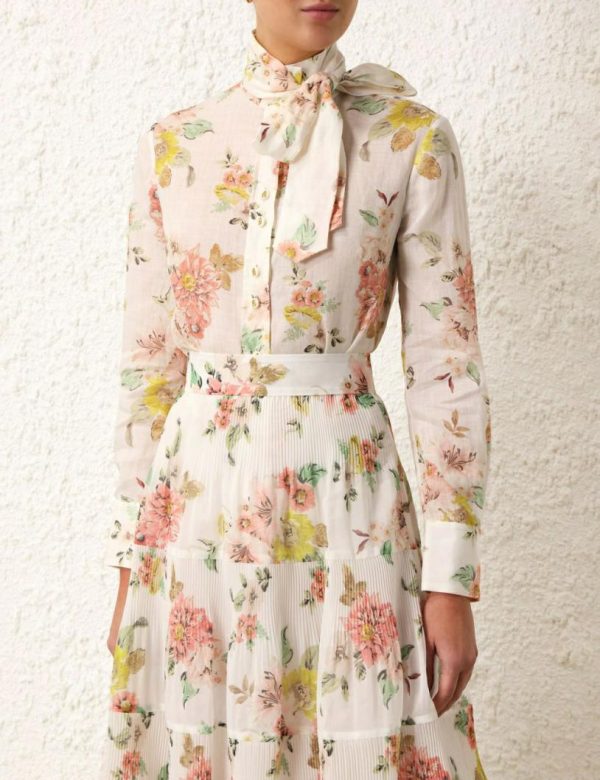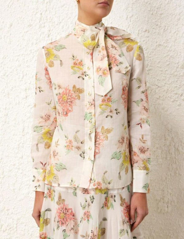The Blouse in Coral Floral from our Resort 2024 Collection, Matchmaker. A ramie shirt featuring a classic collar, removable neck tie and centre back box pleat.