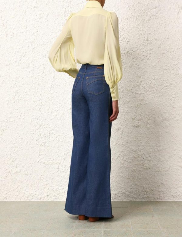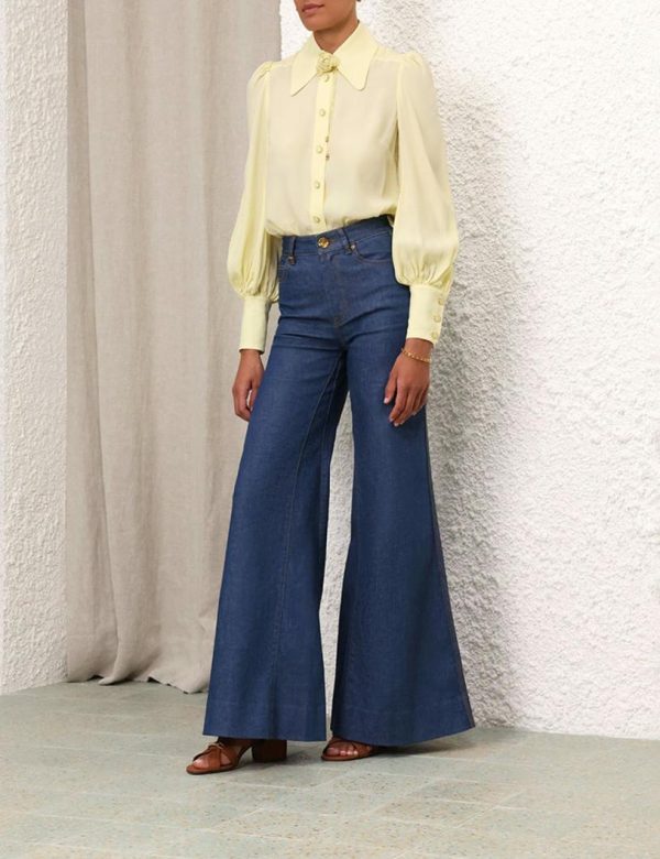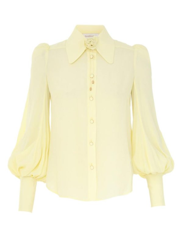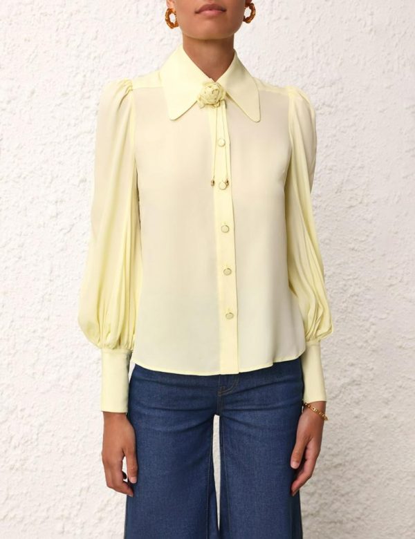 The Blouson Shirt in Lemon from our Resort 2024 Collection, Matchmaker. A shirt featuring a blouson sleeve, buttons down the centre front and a 3D moulded flower tie.