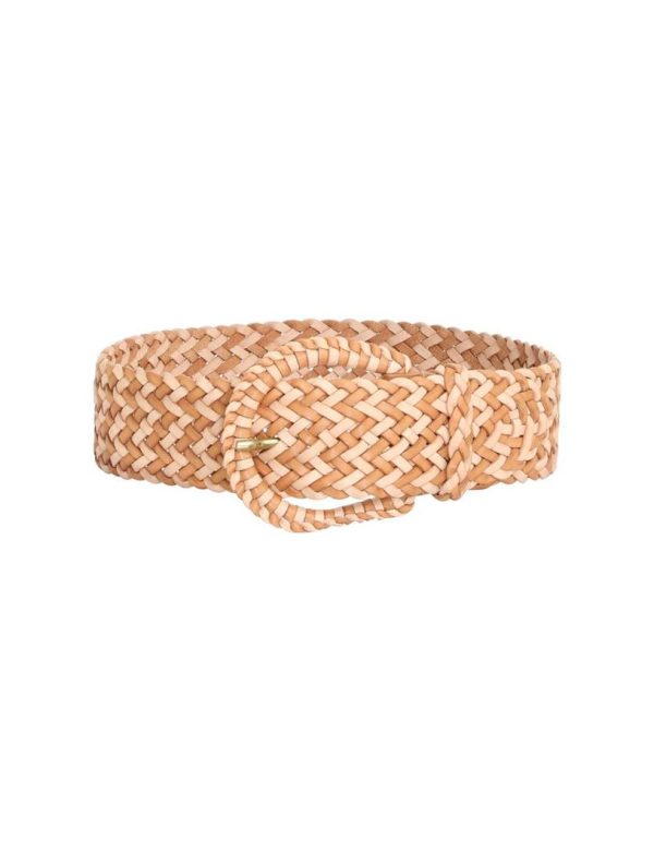 The Braided Leather Waist Belt in Tan/Desert from our Summer Swim 2023 Collection. A braided belt featuring strands cof contrast leather and a rounded buckle.