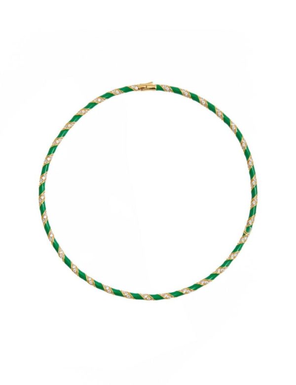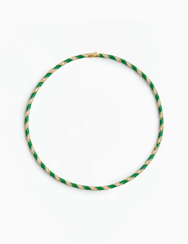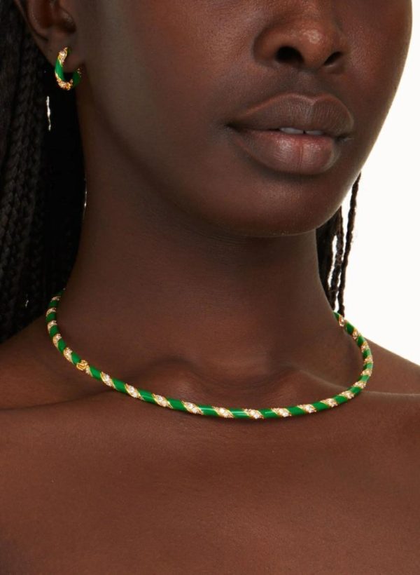 The Candy Stripe Pave Choker in Gold/Green from our Spring 2023 Collection, Wonderland. A gold plated choker featuring cubic zirconia stones throughout.