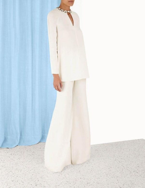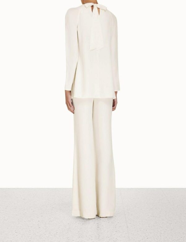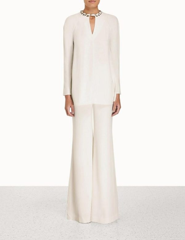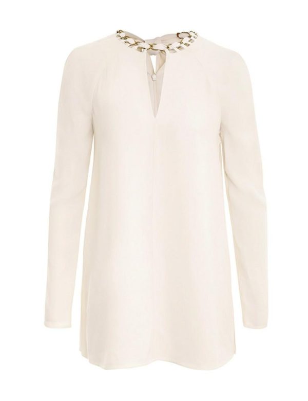 The Chain Embellished Tunic Top in Cream from our Fall 2023 Collection, Luminosity. A long sleeve tunic top featuring a chain detail neckline and necktie.