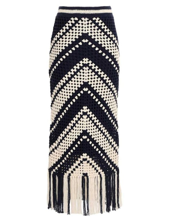 The Chintz Crochet Fringed Skirt in Cream/Navy from our Summer Swim 2023 Collection. A crochet midi skirt featuring a fringed hem and contrast elastic waistband.