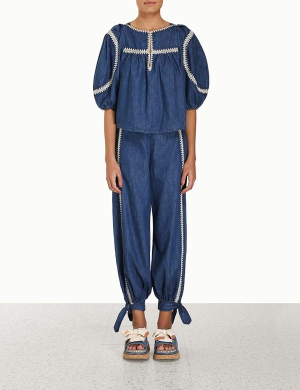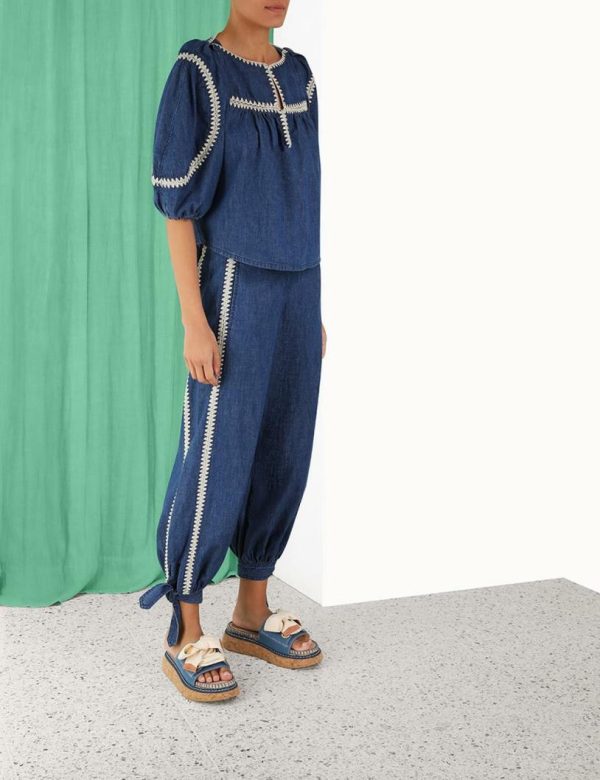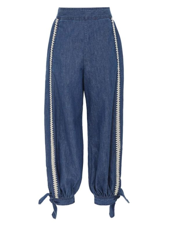 The Chintz Denim Harem Pant in Bay Blue from our Summer Swim 2023 Collection. A denim harem pant featuring self tie ankle cuffs and embroidered trims throughout.