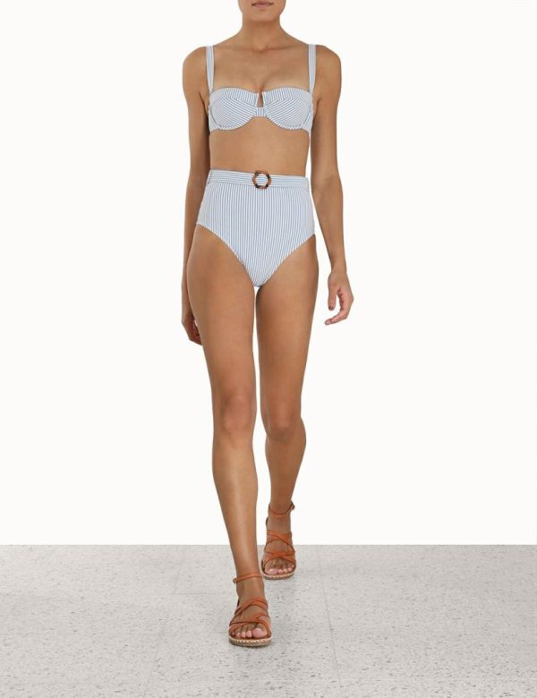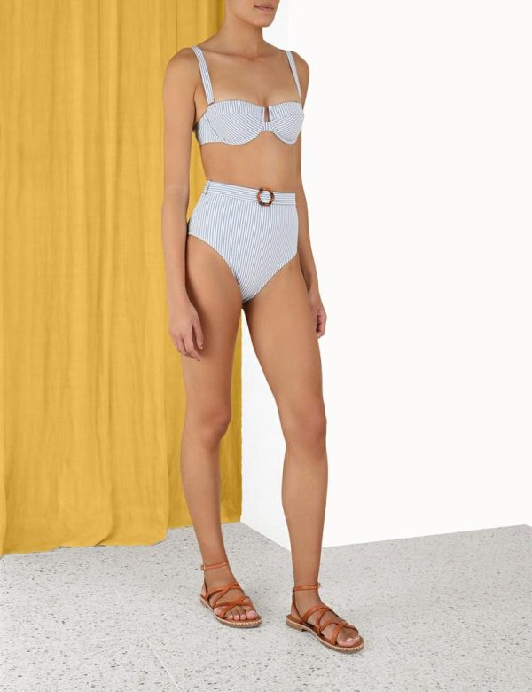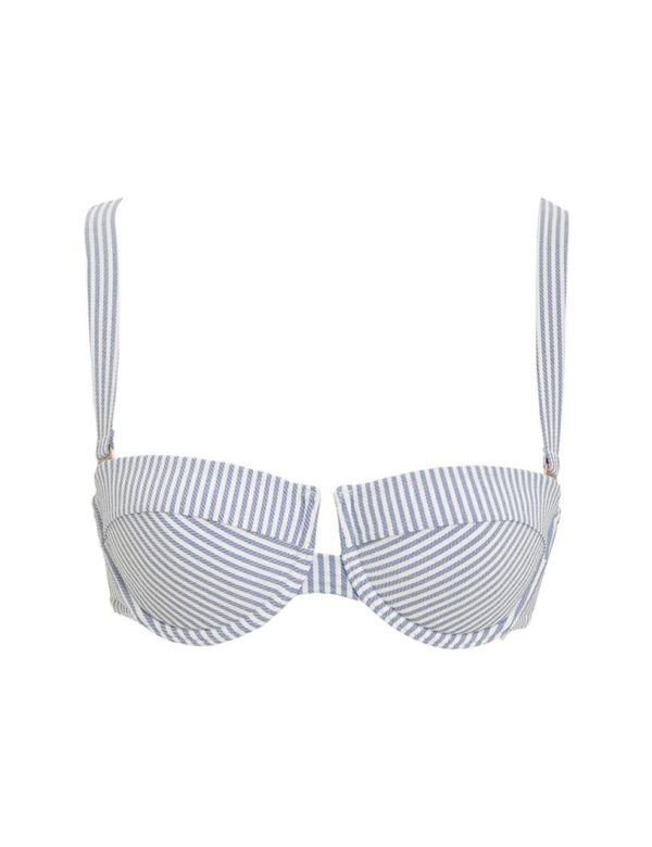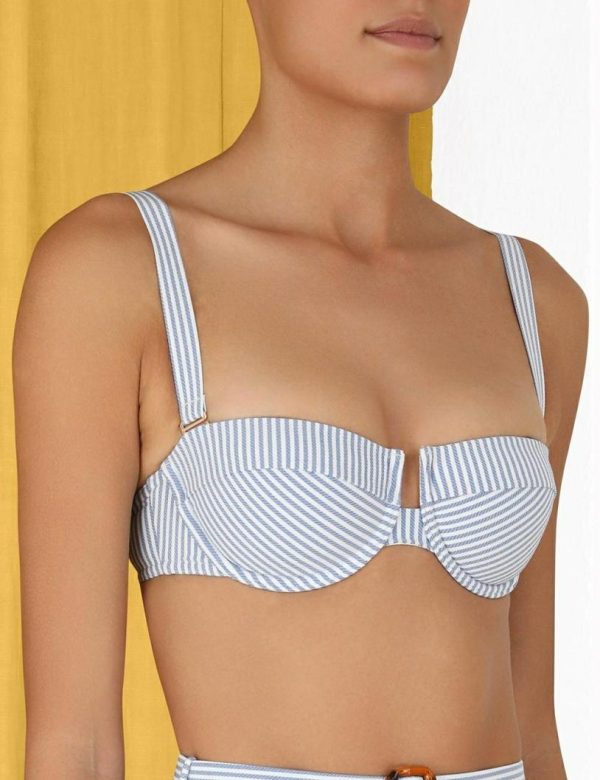 The Chintz Stripe Balconette Bra in Cream/Blue Stripe from our Summer Swim 2023 Collection. A balconette bandeau bikini top constructed from striped Italian lycra.