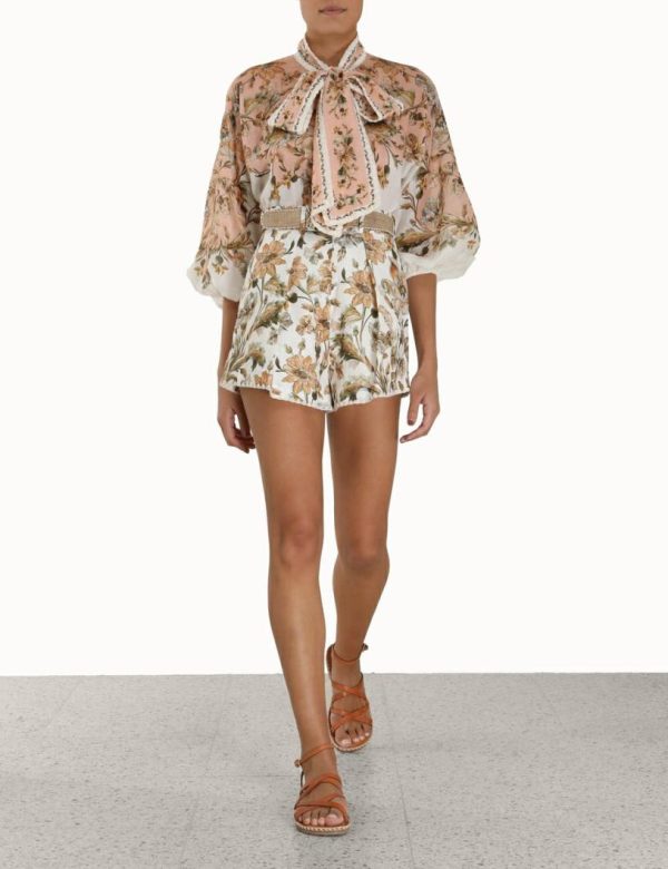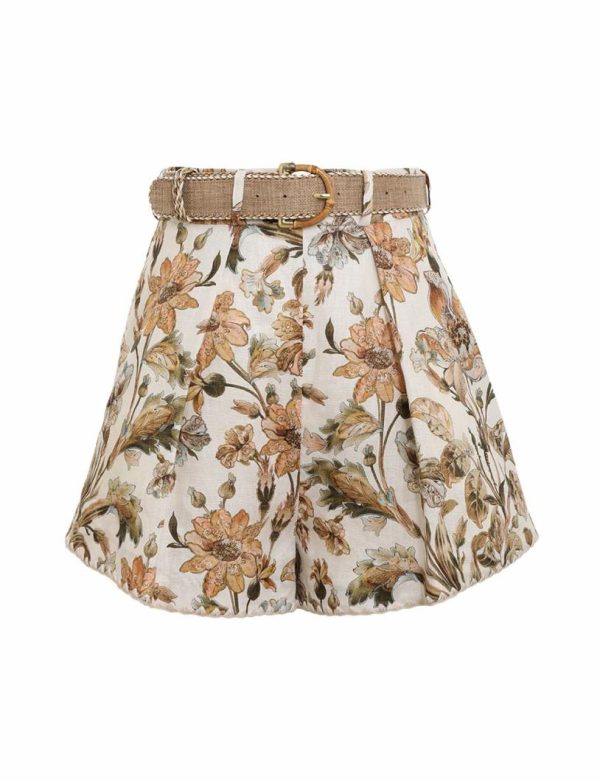The Chintz Tuck Short in Ivory Daisy Floral from our Summer Swim 2023 Collection. A high waisted linen short featuring a floral placement print throughout and embroidered trims along the edges.