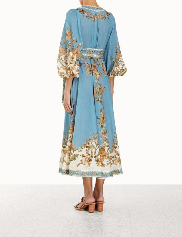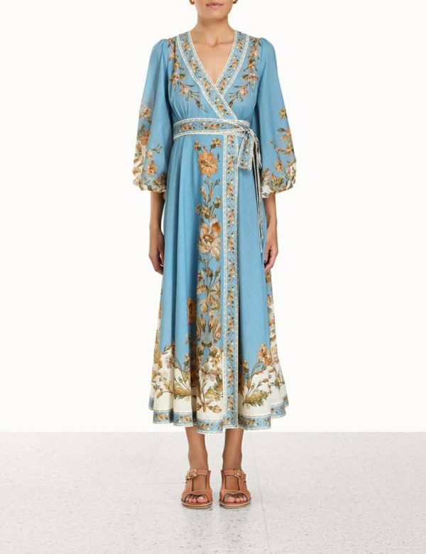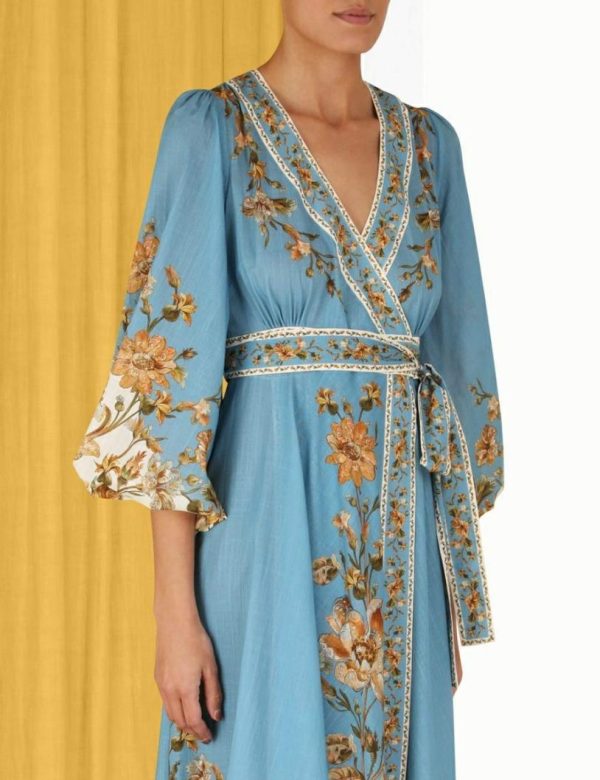 The Chintz Wrap Midi Dress in Blue Daisy Floral from our Summer Swim 2023 Collection. A cotton midi dress featuring a wrap front silhouette and a self tie belted waist.