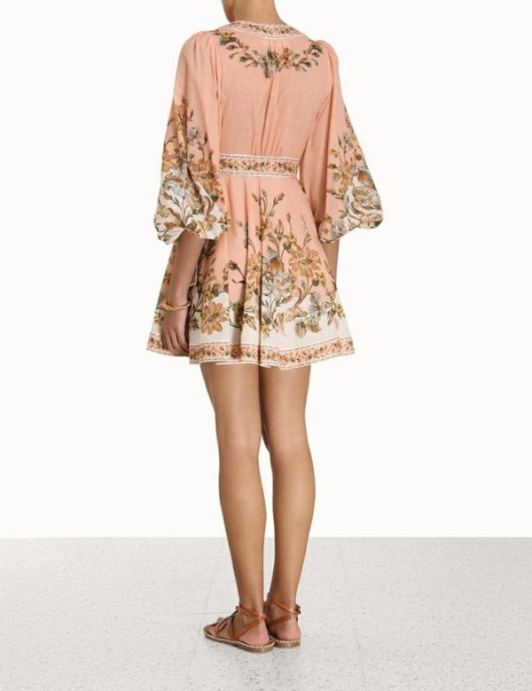 The Chintz Wrap Mini Dress in Pink Daisy Floral from our Summer Swim 2023 Collection. A cotton mini dress featuring a wrap front silhouette and a self tie belted waist.