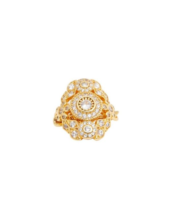 The Collage Statement Ring in Gold from our Spring 2023 Collection, Wonderland. A gold plated fine chain ring featuring pearl and cubic zirconia stones.