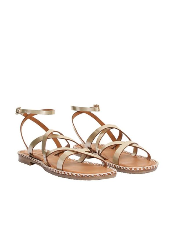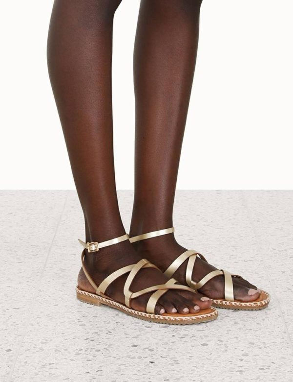 The Criss-Cross Sandal in Gold from our Summer Swim 2023 Collection. A leather sandal featuring criss-crossed straps and buckle ankle fastening.