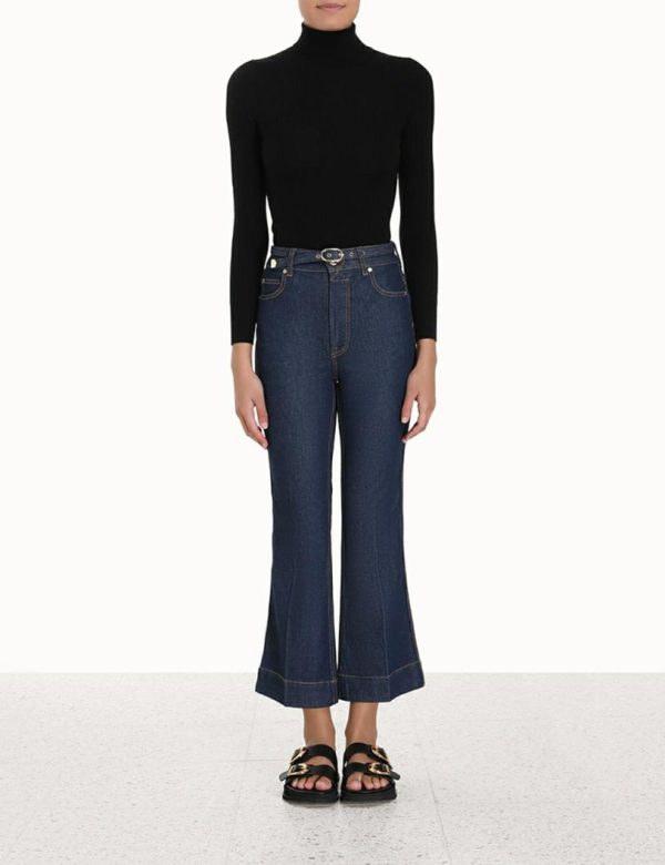 The Cropped Flare Jean in Ink from our Fall 2023 Collection, Luminosity. A cropped denim jean featuring a high waisted, flare silhouette and a removable belt.