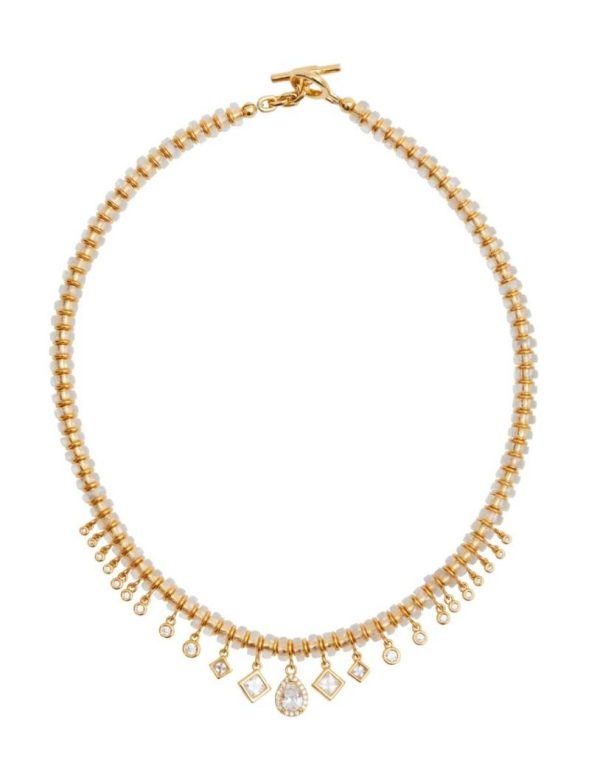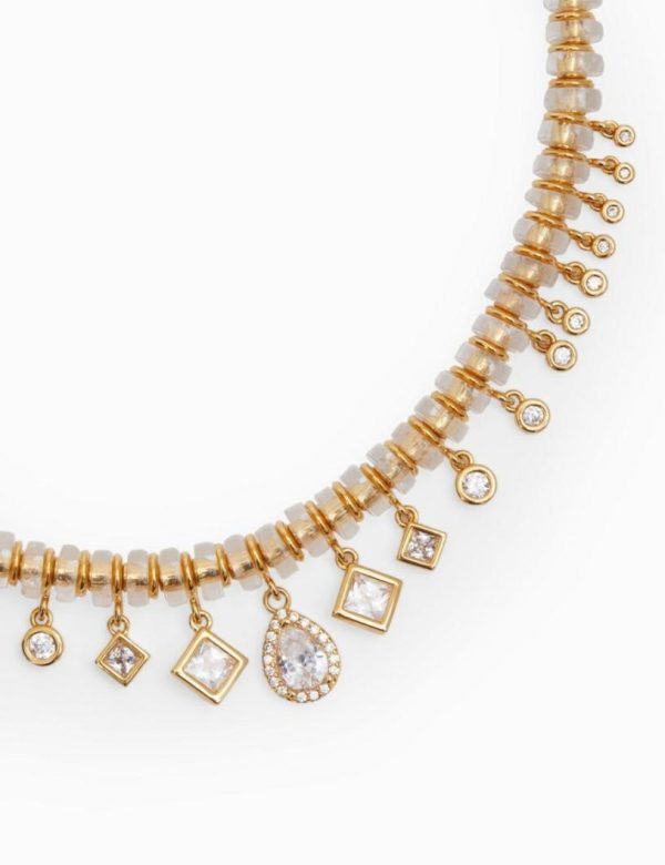 The Crystal Beads Necklace in Gold/Transparent Quartz from our Fall 2023 Collection, Luminosity. A gold plated chain necklace featuring mini pendants of transparent quartz and cubic zironia.