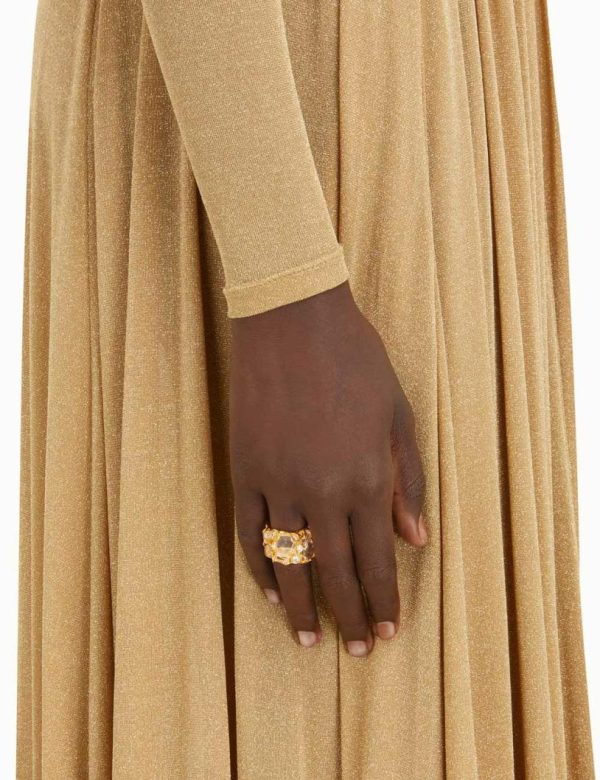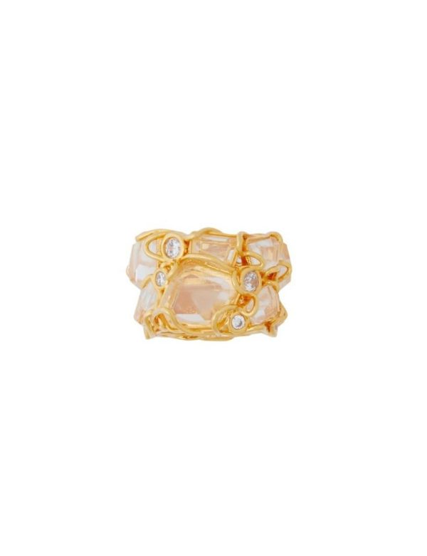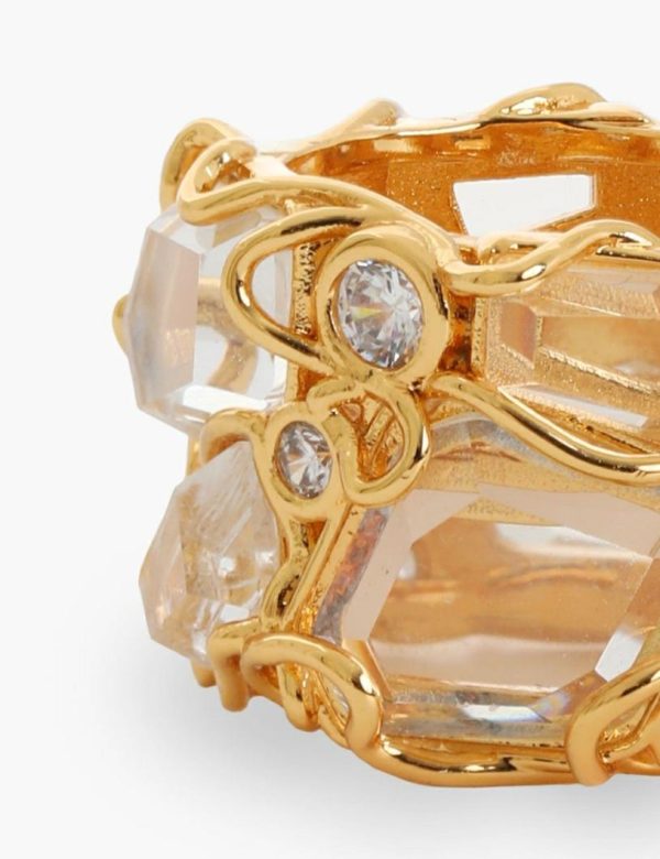 The Crystal Swirl Ring in Gold/Transparent Quartz from our Fall 2023 Collection, Luminosity. A gold plated ring featuring transparent quartz and cubic zirconia stones throughout.