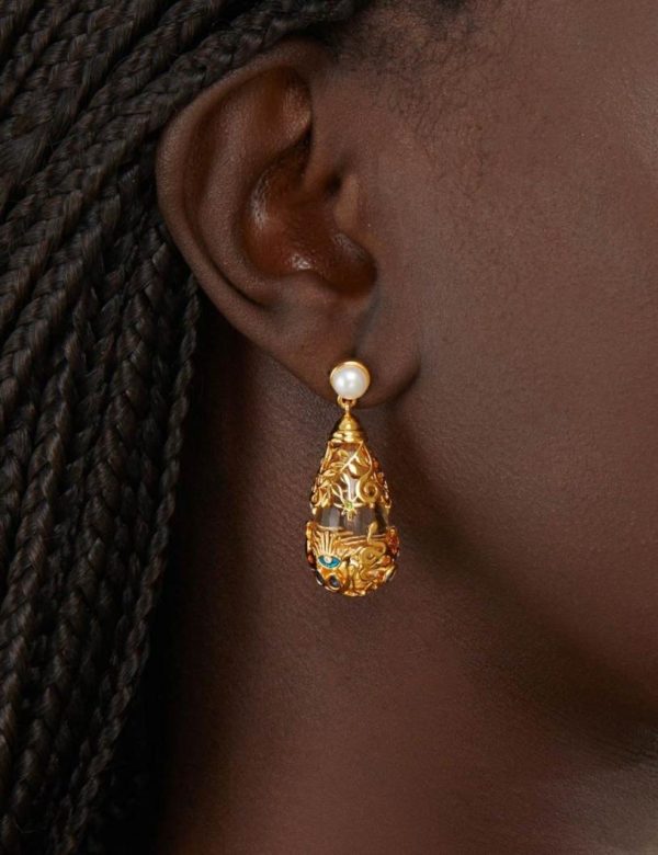 The Crystal Tarot Drop Earrings in Gold/Quartz from our Spring 2023 Collection, Wonderland. A gold plated drop earring featuring a detailed casting with semi precious stones and cubic zirconia.