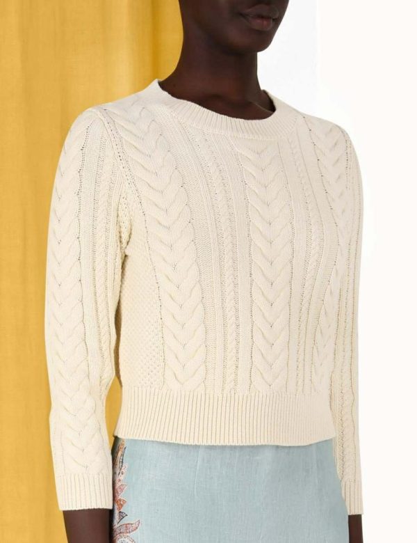 The Devi Cable Knit Top in Cream from our Summer Swim 2023 Collection. A short sleeve top featuring a cable knit throughout.