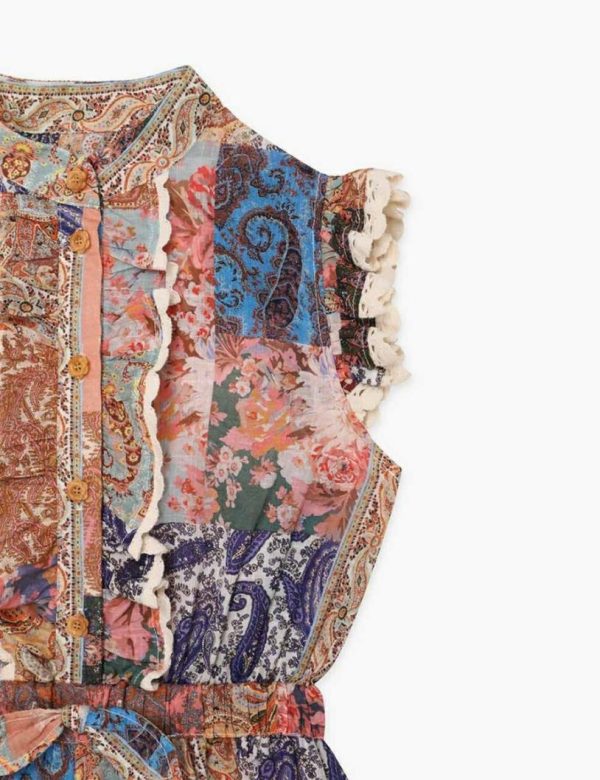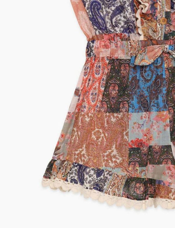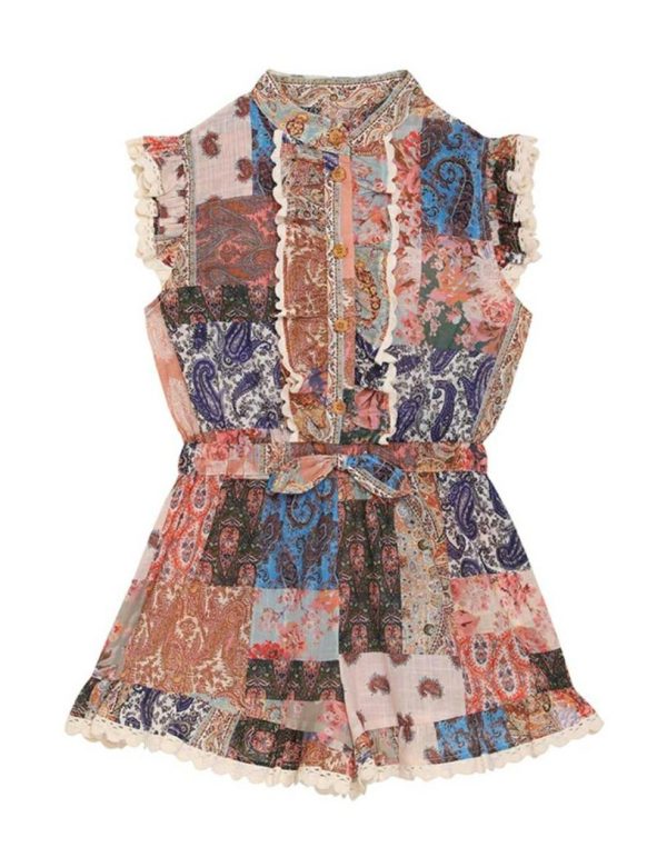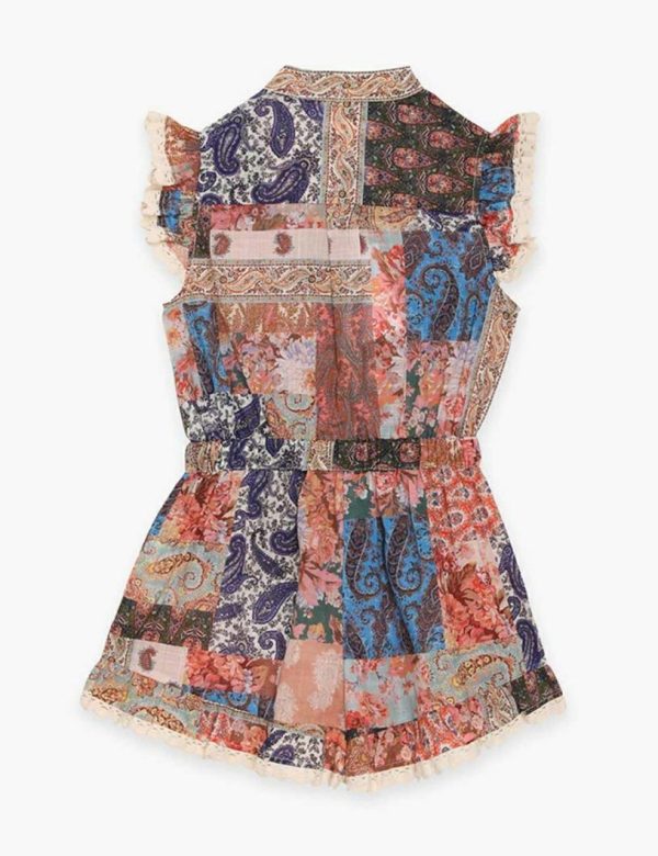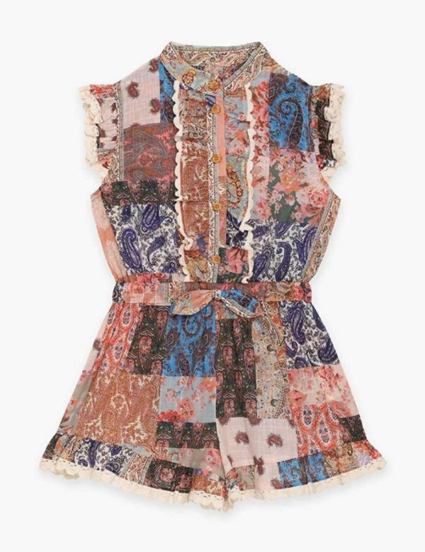 The Devi Frill Playsuit in Patch Paisley from our Summer Swim 2023 Collection. A cotton playsuit featuring a drawstring waist, frilled sleeves and hems and scalloped edging throughout.