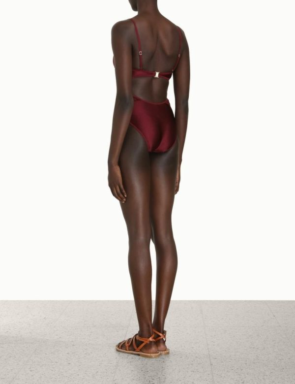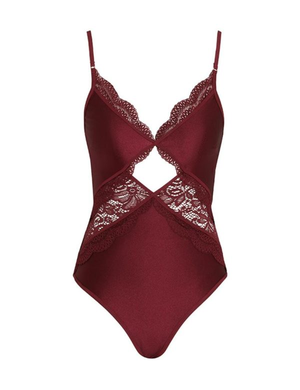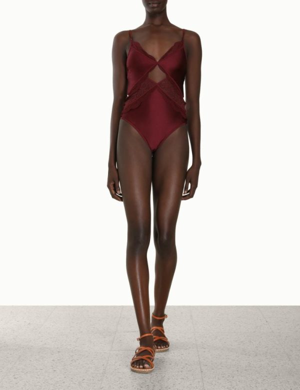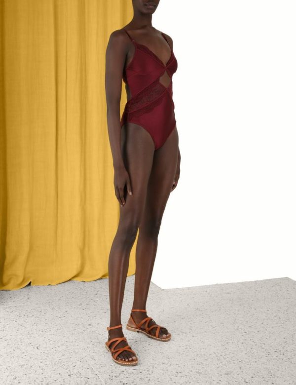 The Devi Lace Cutout 1PC in Burgundy from our Summer Swim 2023 Collection. A shiny lycra one piece featuring a scalloped elastic trim with scalloped lace, adjustable shoulder straps, and a centre back clip.