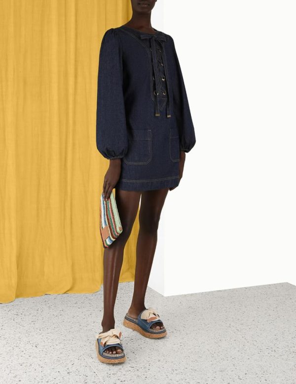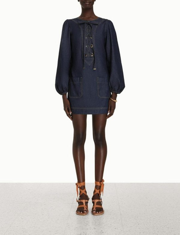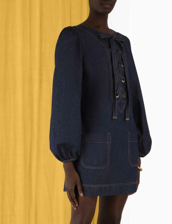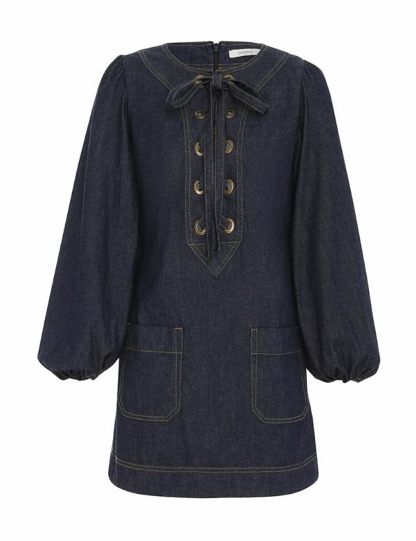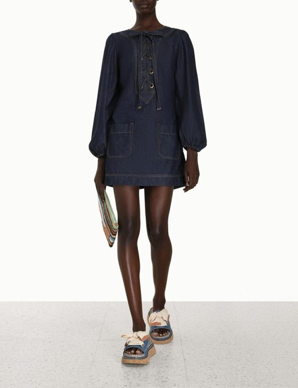 The Devi Lace Up Tunic Dress in Midnight from our Summer Swim 2023 Collection. A tunic dress featuring elasticated sleeves, topstitching throughout, front pockets, and eyelets on the yoke with a lace up tie.