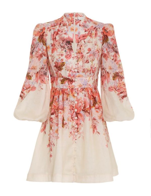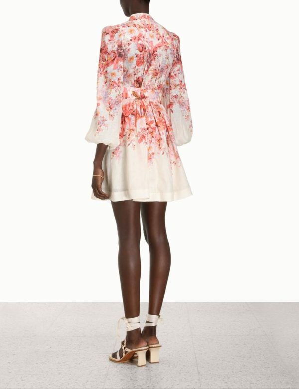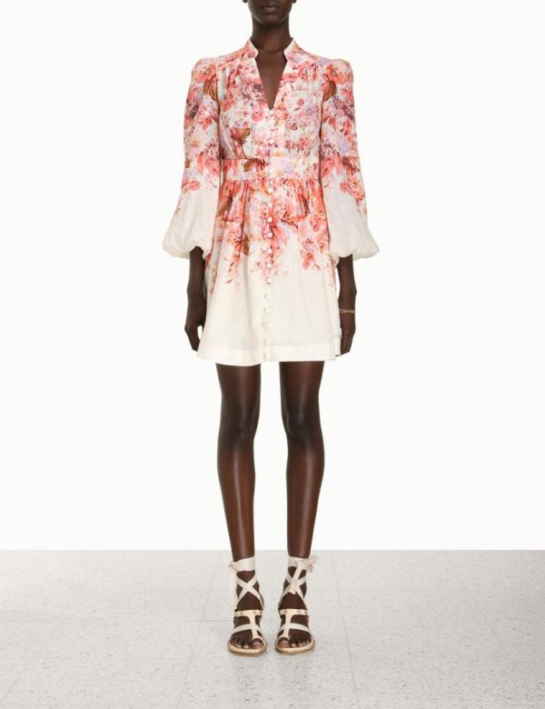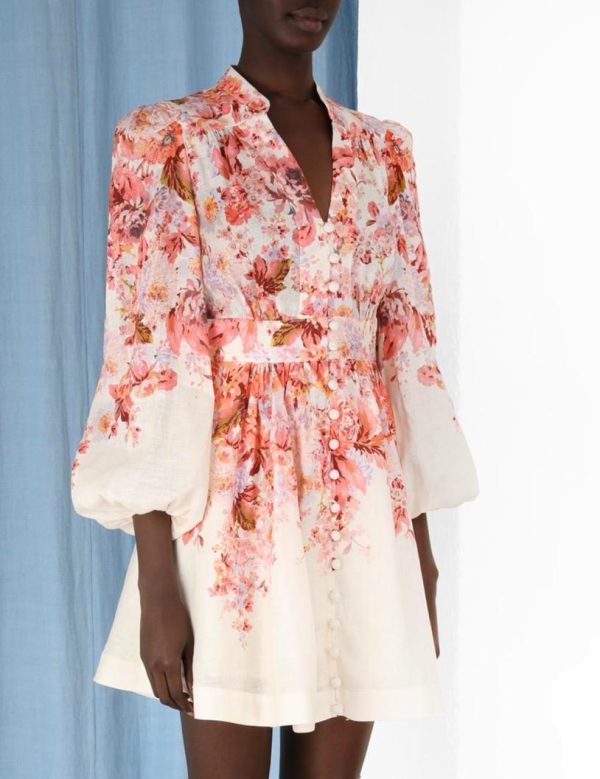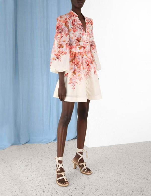 The Devi Plunge Mini Dress in Cream Floral from our Summer Swim 2023 Collection. A linen mini dress featuring a plunging V-neckline and exaggerated sleeves, finished with buttons down the centre front.