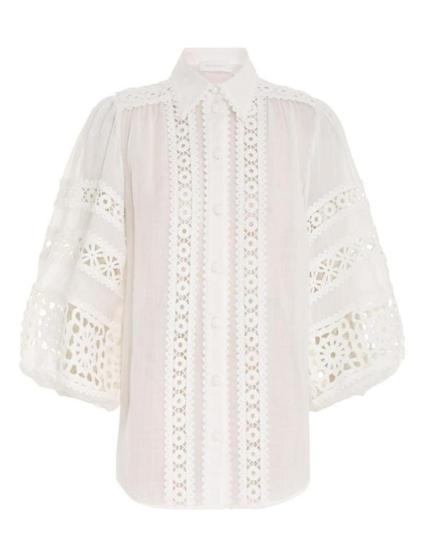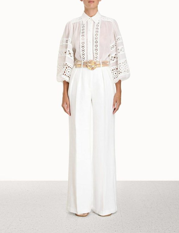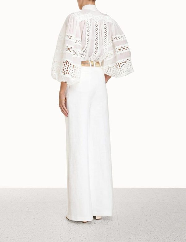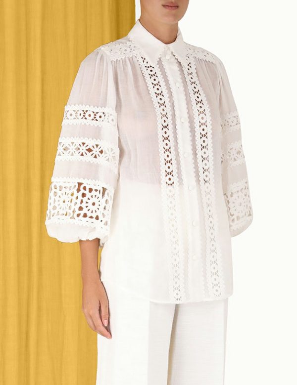 The Devi Spliced Billow Blouse in Ivory from our Summer Swim 2023 Collection. A ramie blouse featuring a classic shirt collar and billow sleeves, finished with placement cutaway trims throughout.