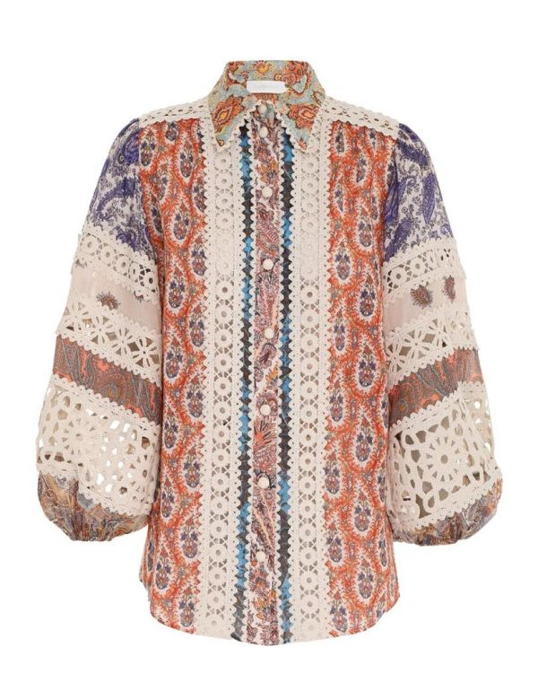 The Devi Spliced Billow Blouse in Spliced Paisley from our Summer Swim 2023 Collection. A ramie blouse featuring spliced prints and billow sleeves with trim details.