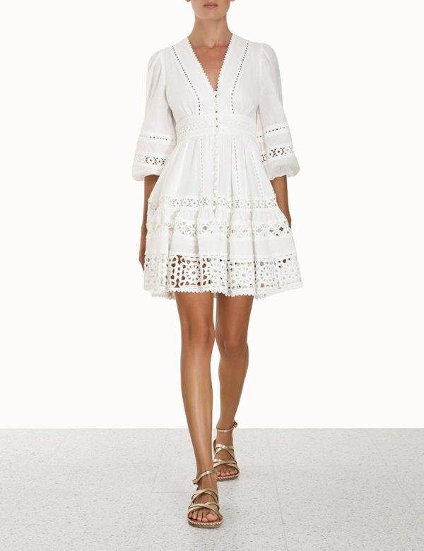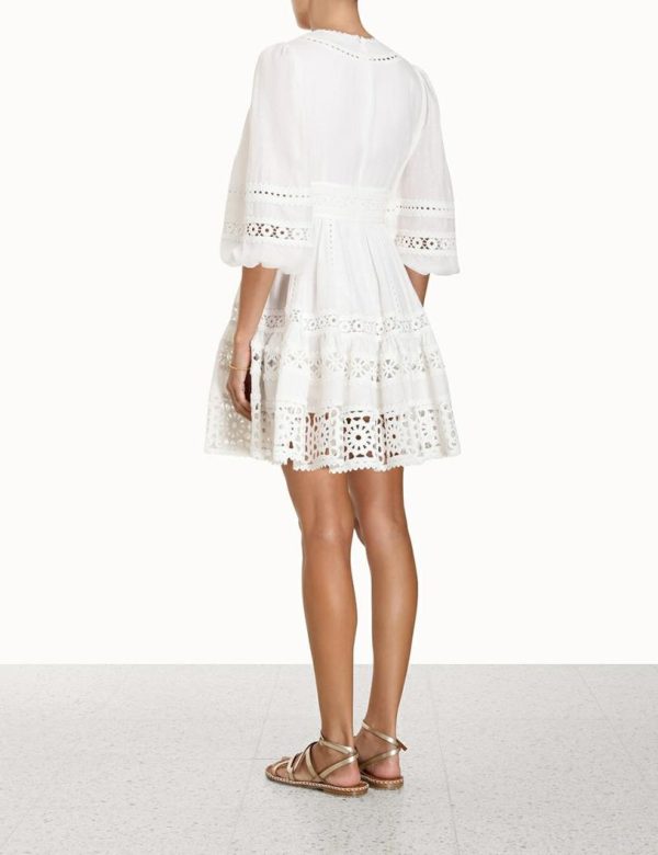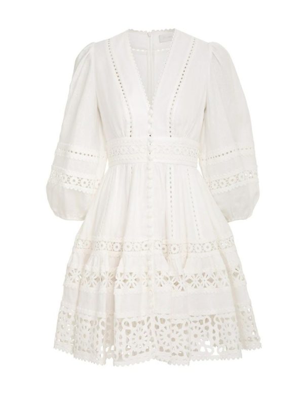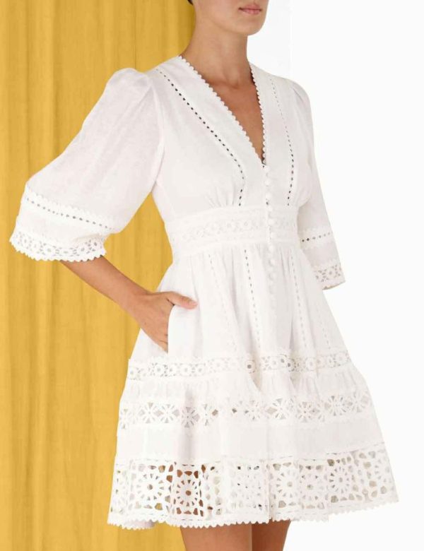 The Devi Spliced Billow Mini Dress in Ivory from our Summer Swim 2023 Collection. A spliced linen midi dress featuring a gathered drop hem and cutaway crotchet trims throughout.