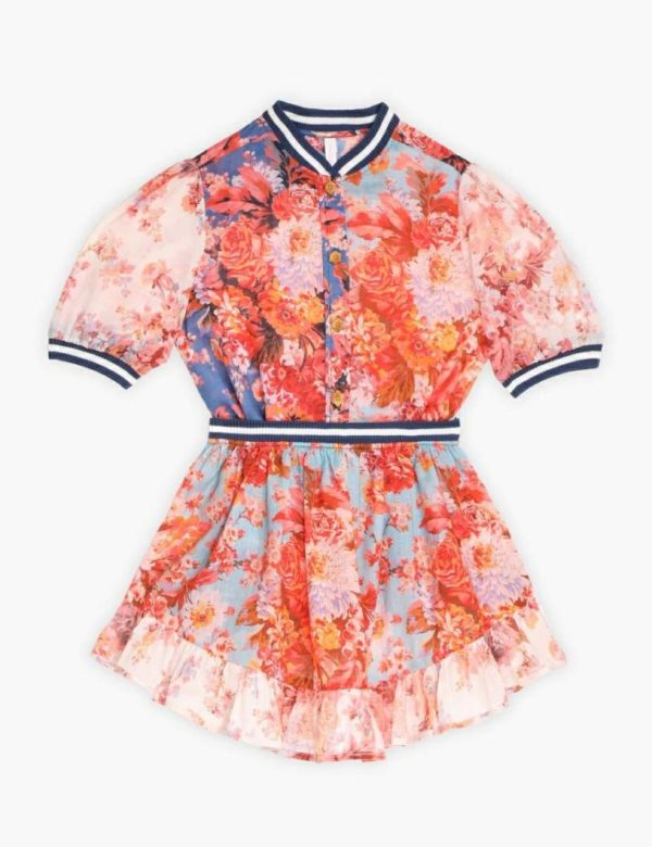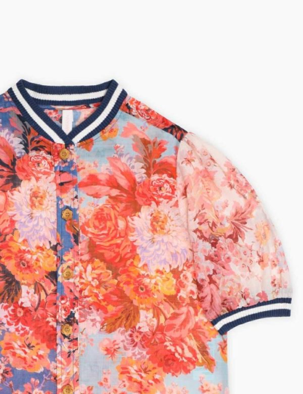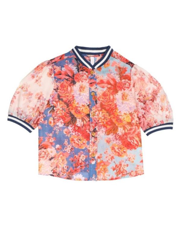 The Devi Sporty Blouse in Spliced from our Summer Swim 2023 Collection. A cotton blouse featuring ribbed hems, buttons along centre front, gathering on centre back yoke, and a ribbed collar .