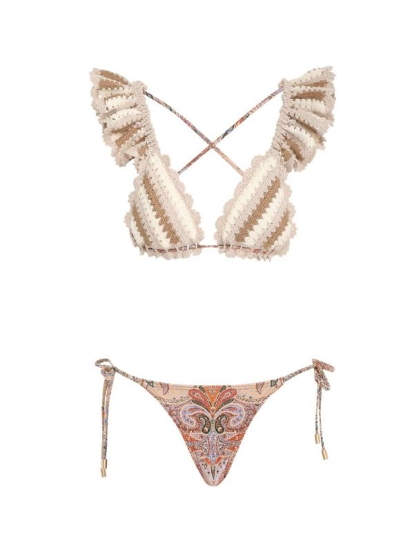 The Devi Stripe Crochet Bikini in Multi Paisley from our Summer Swim 2023 Collection. A bikini set featuring a crochet bra with frills, self tie cross back and a placement print lycra pant.