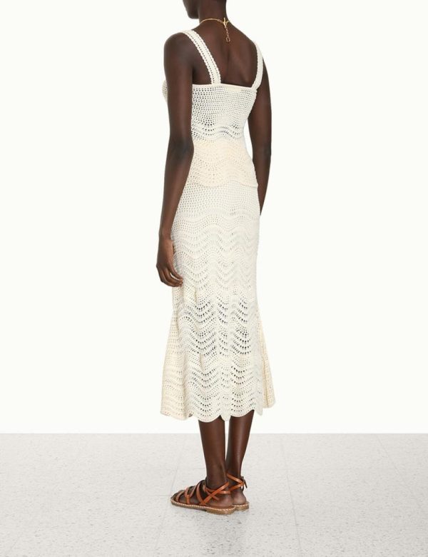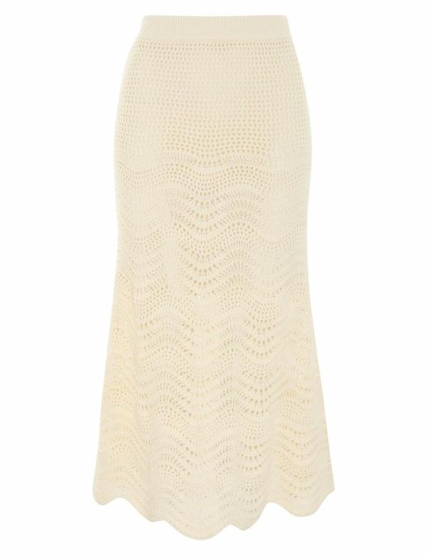 The Devi Textured Knit Skirt in Cream from our Summer Swim 2023 Collection. A midi skirt featuring an elastic waistband and scallop knit throughout.